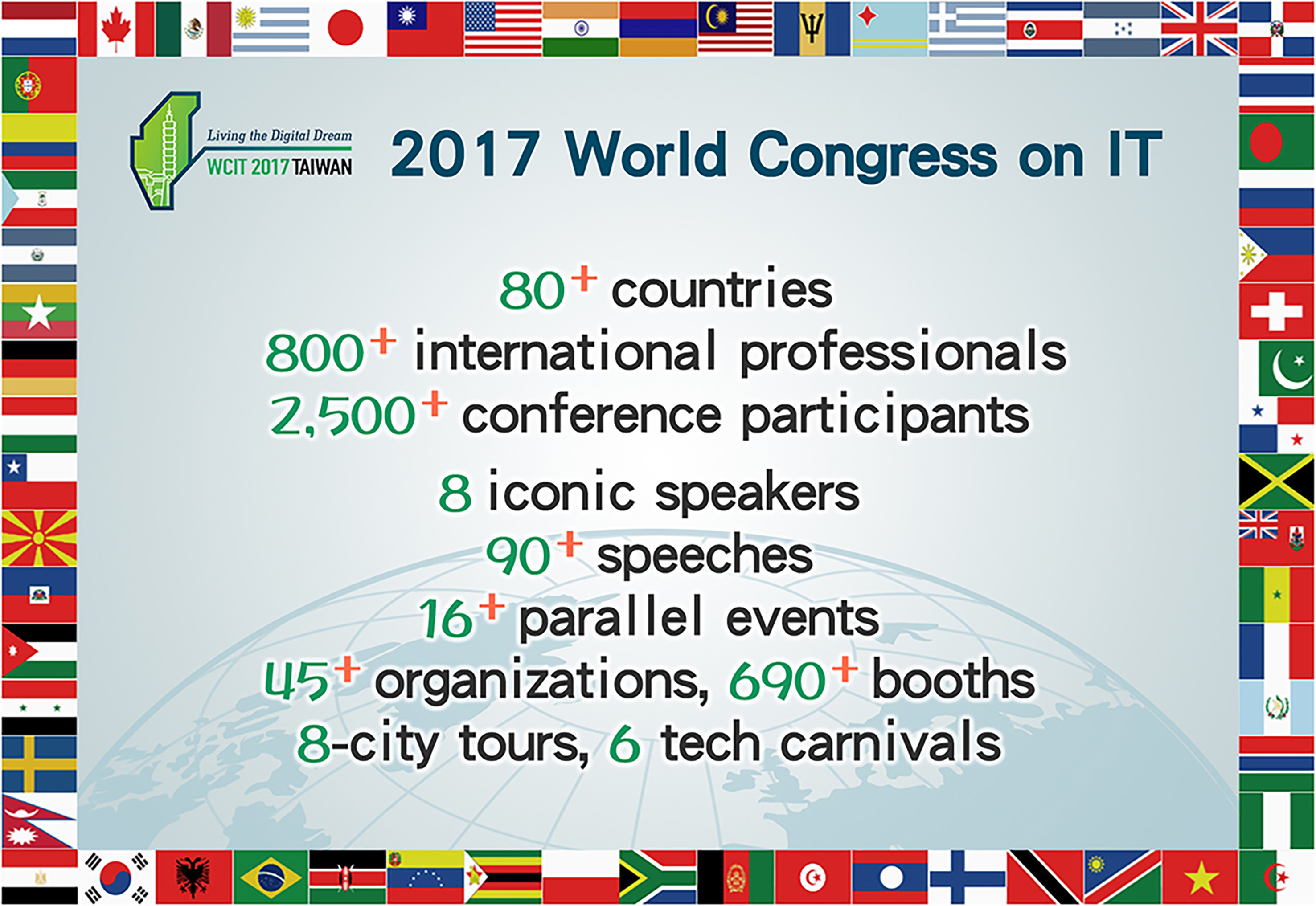Centered on the theme "Taiwan, Living the Digital Dream," WCIT 2017 showcased Taiwan's creative technological soft power and the impact of its information and communications technologies (ICT) around the world. In addition to signaling Taiwan's transformation from hardware contract manufacturing to innovative smart applications, the exhibition demonstrated Taiwan's willingness to provide resources for the next generation, as they pursue their digital dreams and create new visions for innovative technology.
