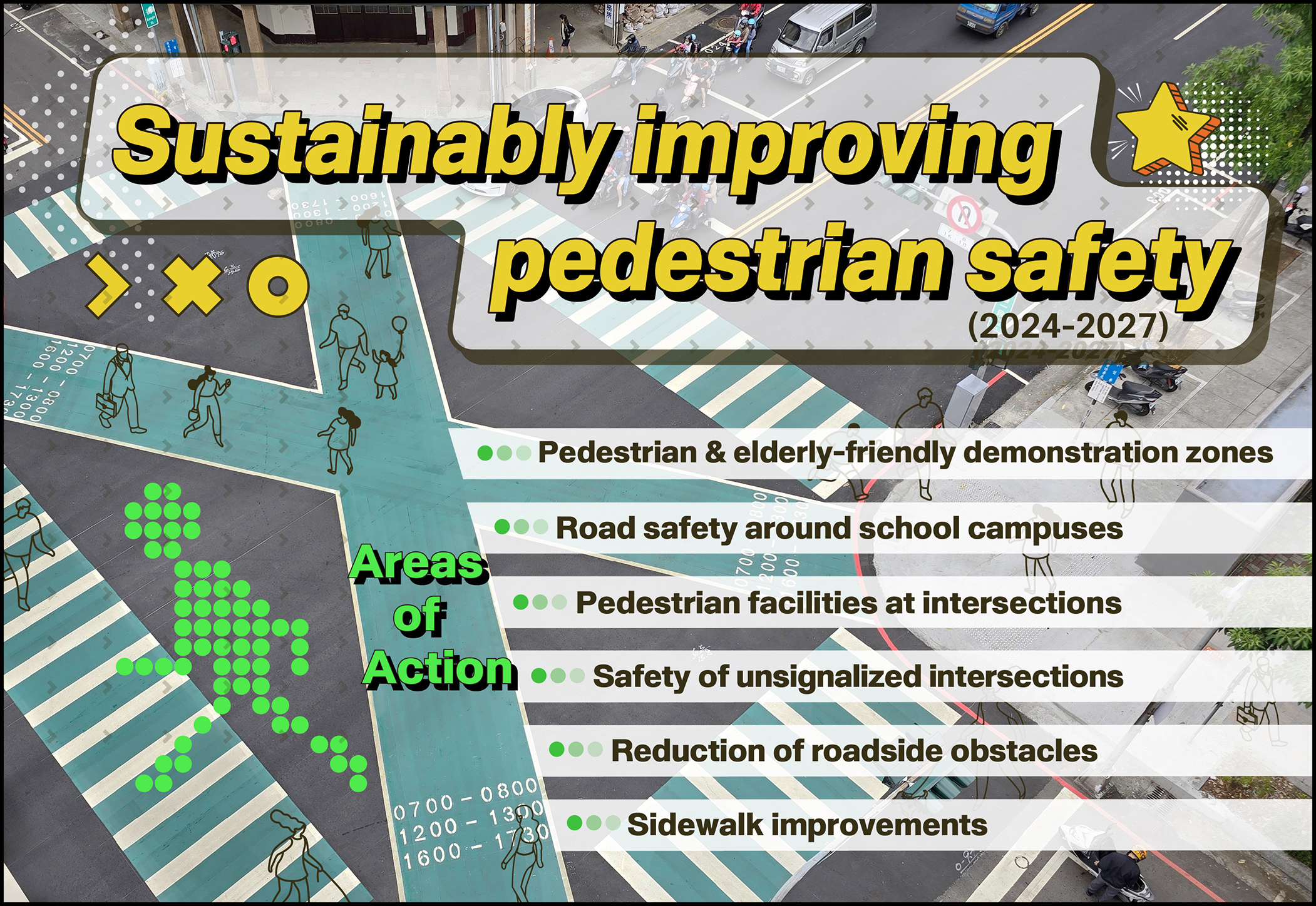 To ensure pedestrians' safety and right of way, the Executive Yuan is allocating NT$40 billion (US$1.2 billion) over four years to fund a sustainable pedestrian safety enhancement program (2024-2027). The program provides subsidies and guidance to local governments to improve pedestrian safety through road projects, and promotes assessment mechanisms that utilize citizen reporting to identify the critical road areas and intersections in need of most attention. This initiative will accelerate the improvement of pedestrian environments and overall road quality, creating a safe and secure environment for all road users.