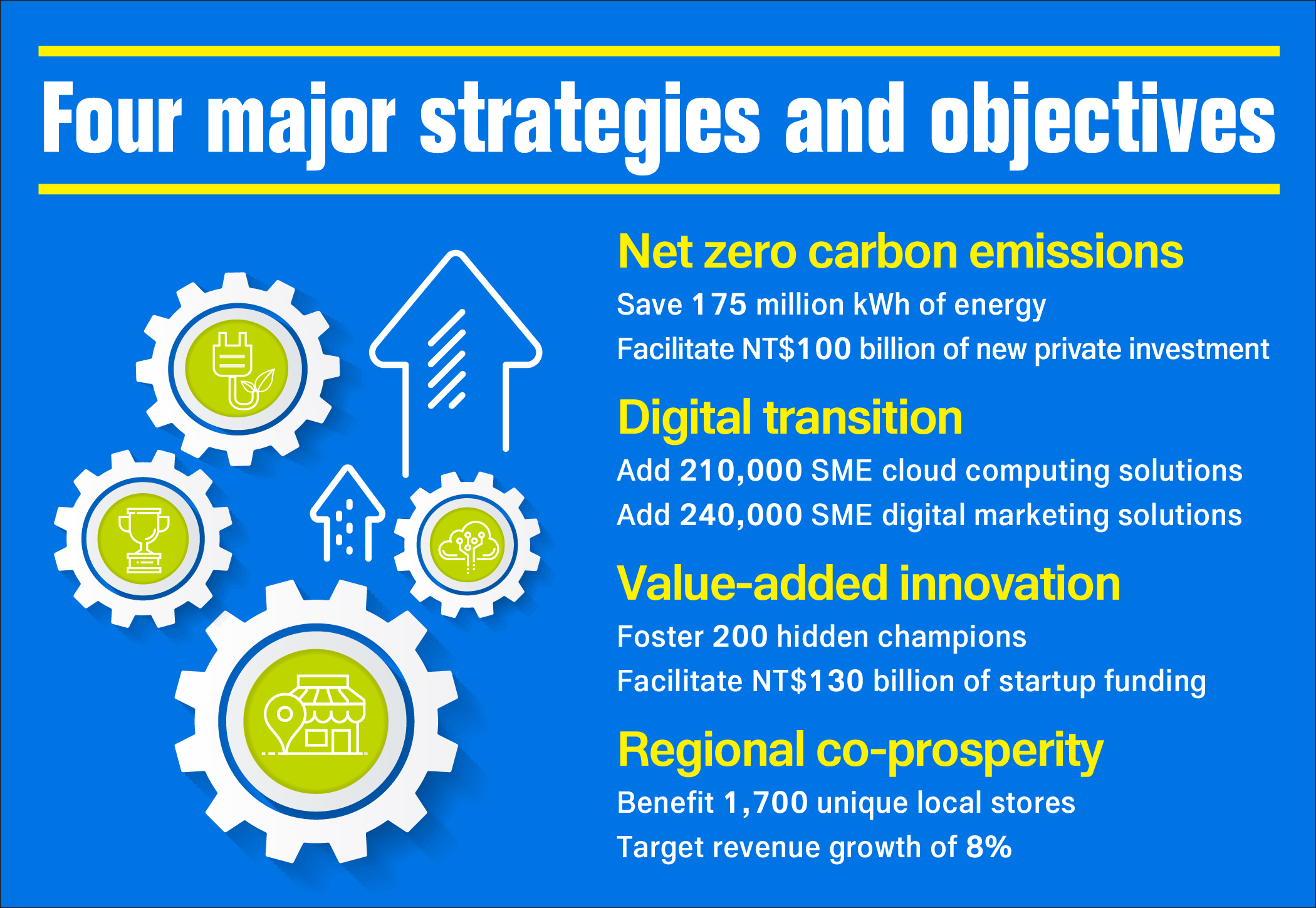 ■ Net-zero carbon emissions: Assist SMEs to establish a low-carbon mindset and capabilities, and employ measures such as preferential loans for green and sustainability initiatives to facilitate the transition to low-carbon business models, while simultaneously encouraging green business investment. Goal: Save 175 million kilowatt-hours (kWh) of power and generate NT$100 billion (US$3.2 billion) of new private investments.