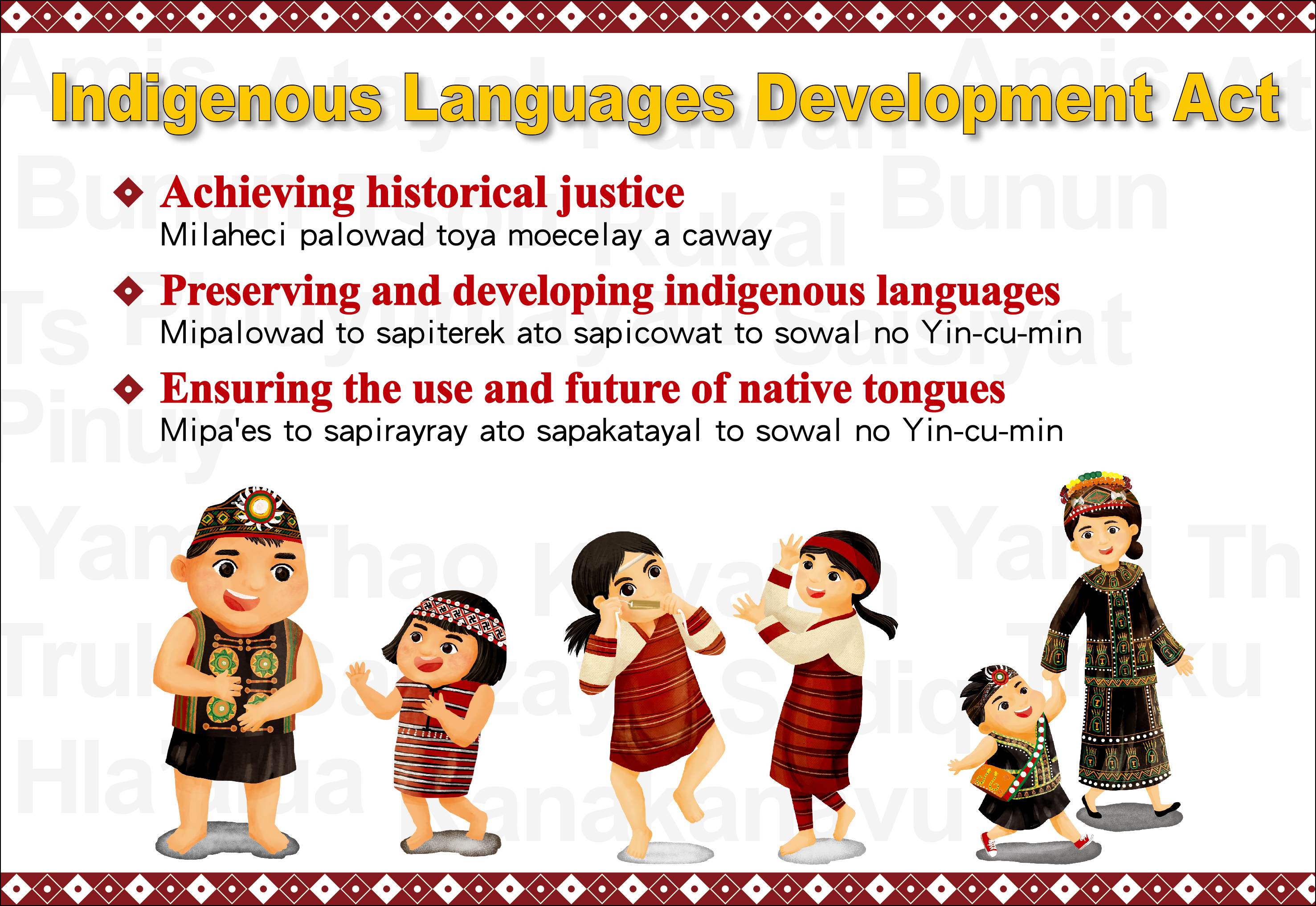 With the evolution of society in Taiwan, daily use of indigenous languages has become increasingly rare. The government has determined that a number of the nation's 16 indigenous languages are facing extinction. To ensure that these languages are preserved and remedy injustices of the past, the Indigenous Languages Development Act was promulgated on June 14, 2017 to define these mother tongues as official national languages.