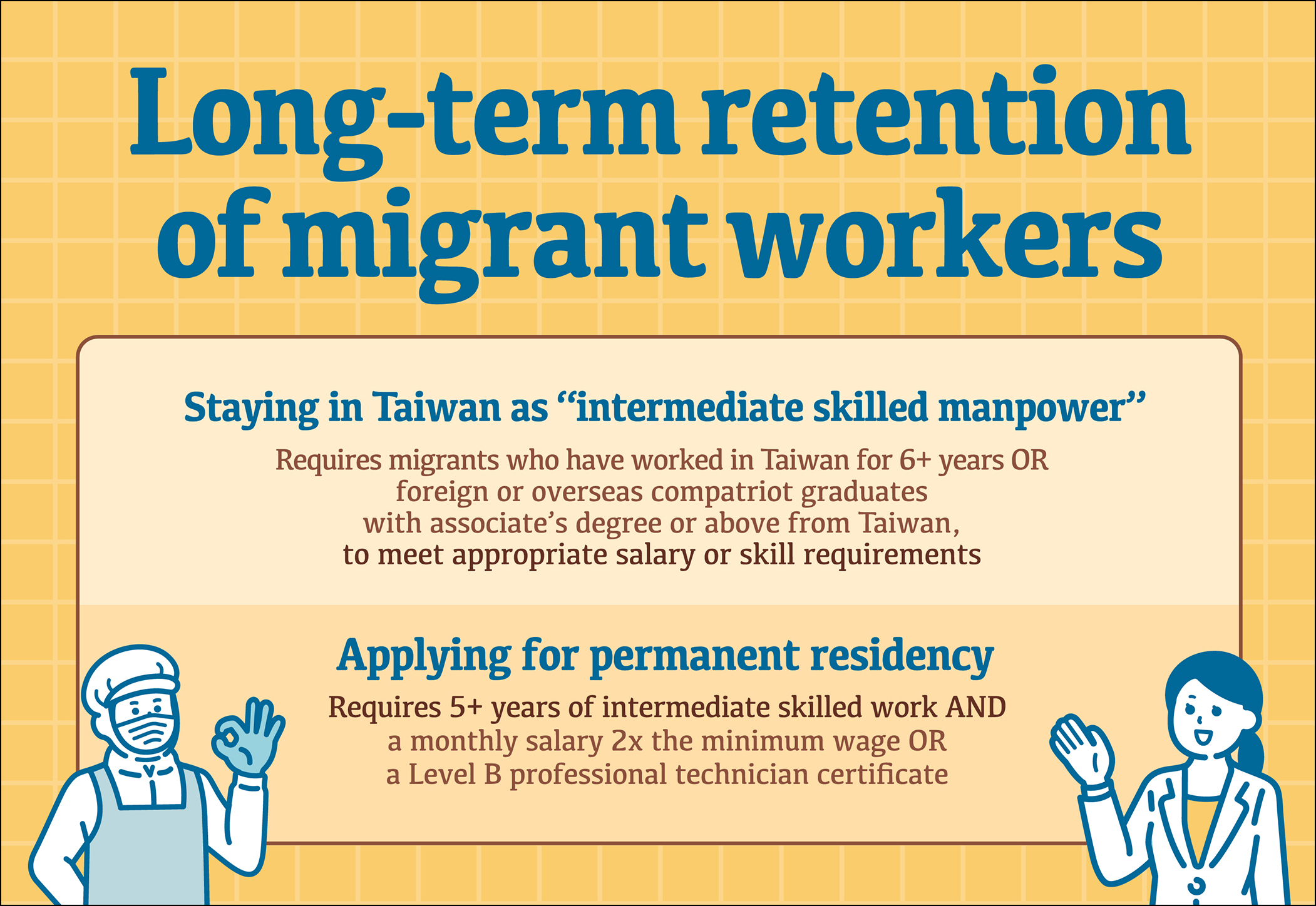 ■ Allow applications for permanent residency: Experienced migrant workers and foreign and overseas compatriot graduates who have been employed as intermediate skilled manpower for at least five years and satisfy relevant provisions of the Immigration Act can apply for permanent residency if their monthly gross salary is at least two times the minimum wage or if they acquire a Level B professional technician certificate.