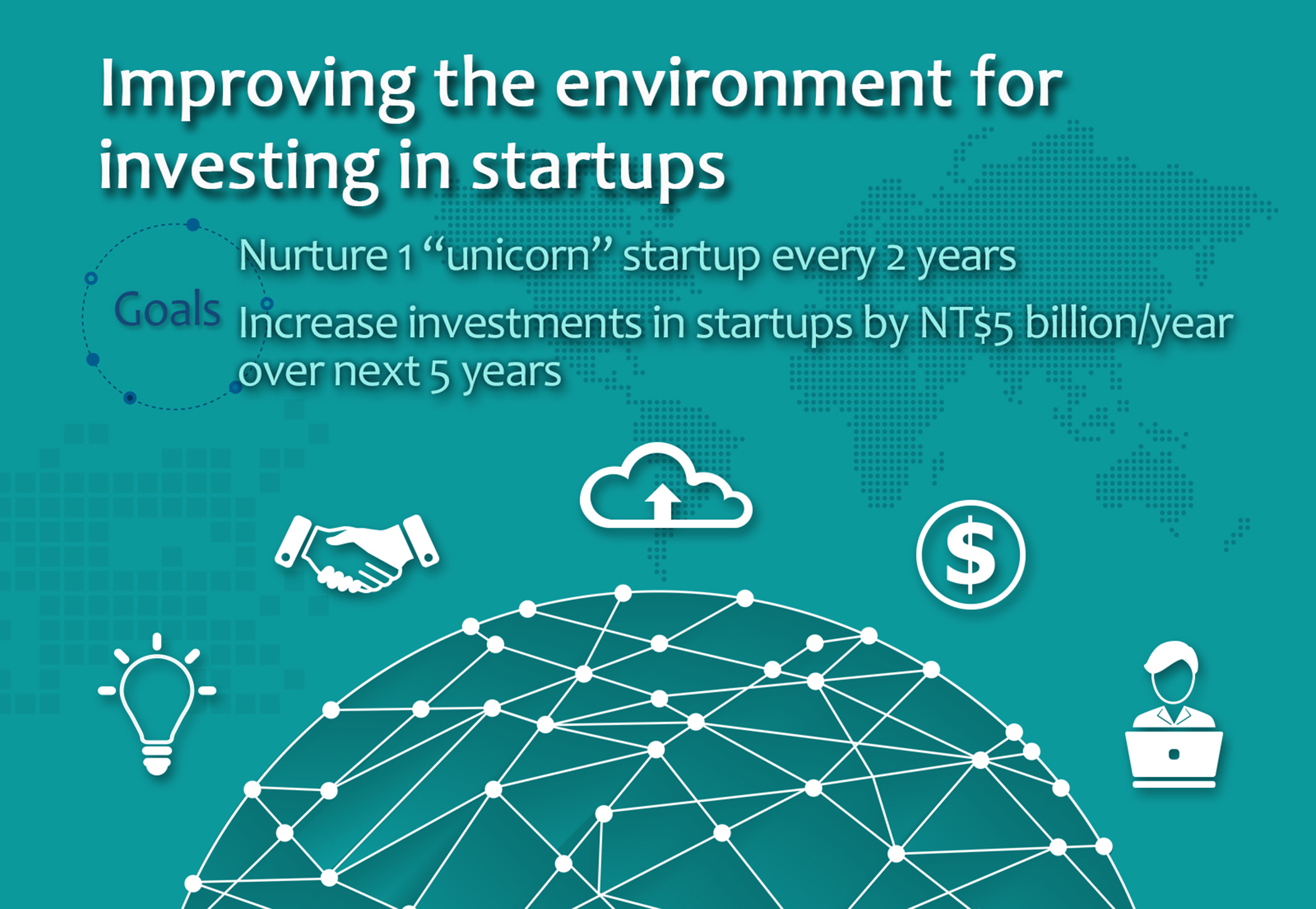 ♦ For the next five years, expand investment in startups by NT$5 billion (US$170.6 million) annually.