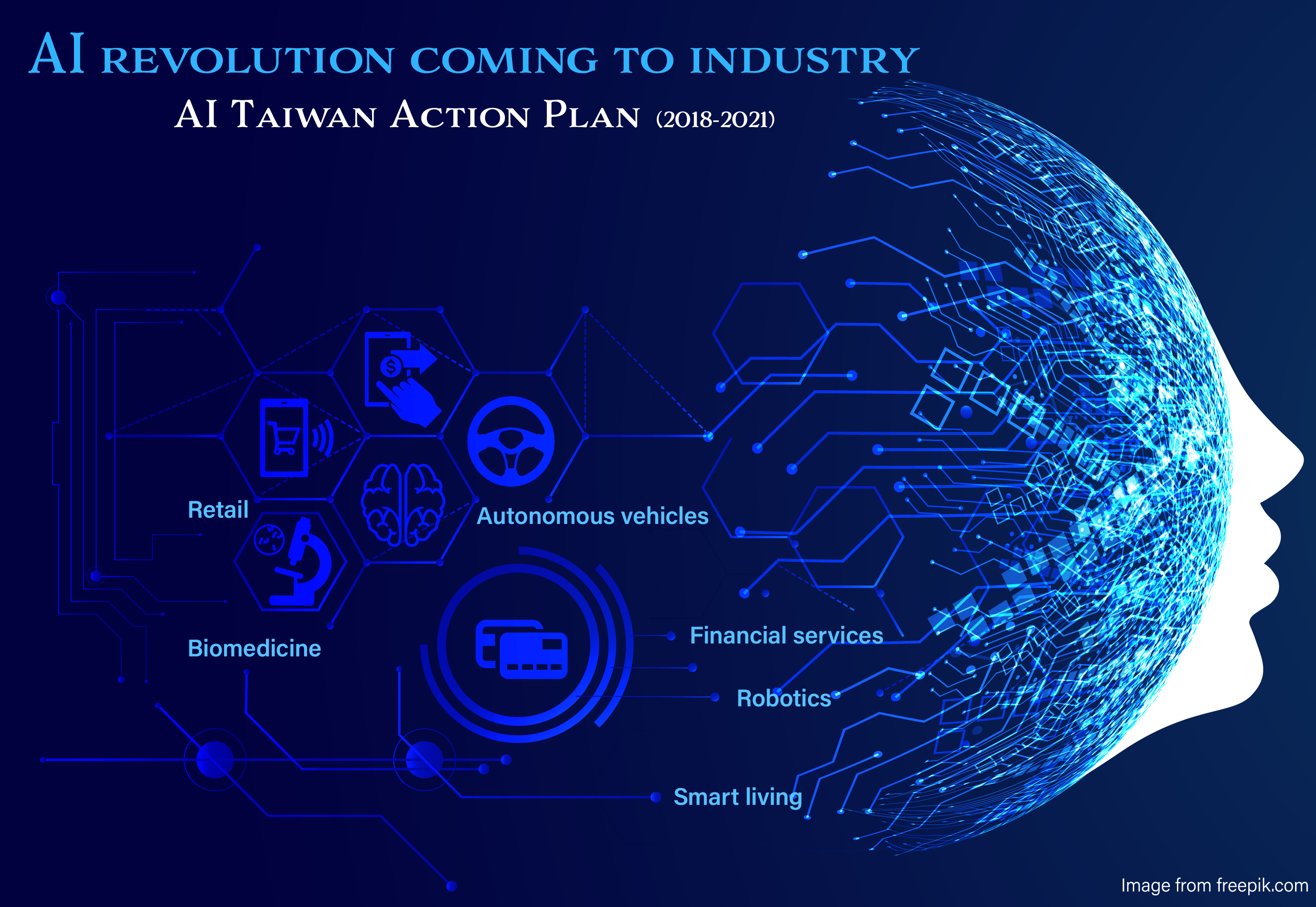 Beyond sparking a scientific and technological revolution, artificial intelligence (AI) will fundamentally transform human life and industry and create boundless business opportunities. Capitalizing on this wave, the government rolled out the AI Taiwan Action Plan (2018-2021) on January 18, 2018 to sharpen Taiwan's advantages, prioritize innovation and real-world implementation, and develop software and hardware in tandem, thereby injecting greater momentum into Taiwan's industries. Efforts to build AI into a comprehensive industry will be guided by the principles of deregulation, open access and technology investment, all with the aim of propelling Taiwan into the ranks of the world's leading smart nations.