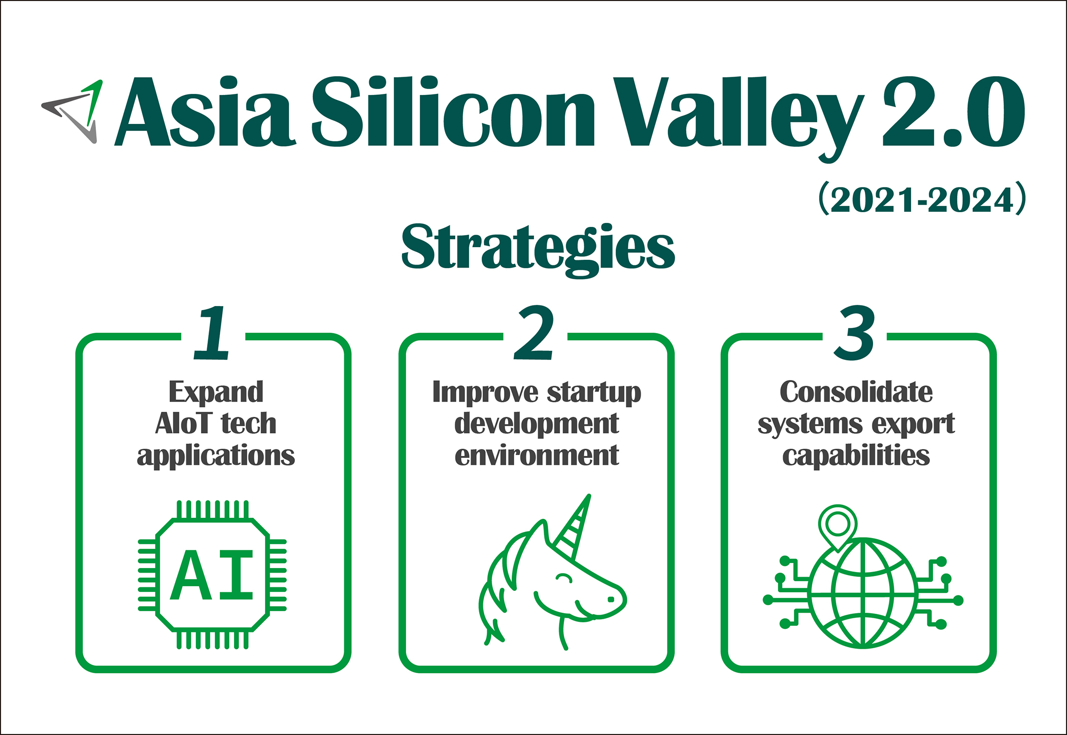 To expand applications of the artificial intelligence of things (AIoT) and improve the startup investment environment, the government rolled out the Asia Silicon Valley Development Plan 2.0 (2021-2024) based on the achievements of the original Asia Silicon Valley Development Plan. By accelerating the evolution of industries through AIoT and driving the future of industry through innovation and entrepreneurialism, Asia Silicon Valley 2.0 will incorporate artificial intelligence (AI), fifth-generation mobile communication technology (5G) and other key technologies of the digital economy to expand the scope of internet-of-things (IoT) applications, encourage export of AIoT solutions, and accelerate the growth and exit of startup businesses.
