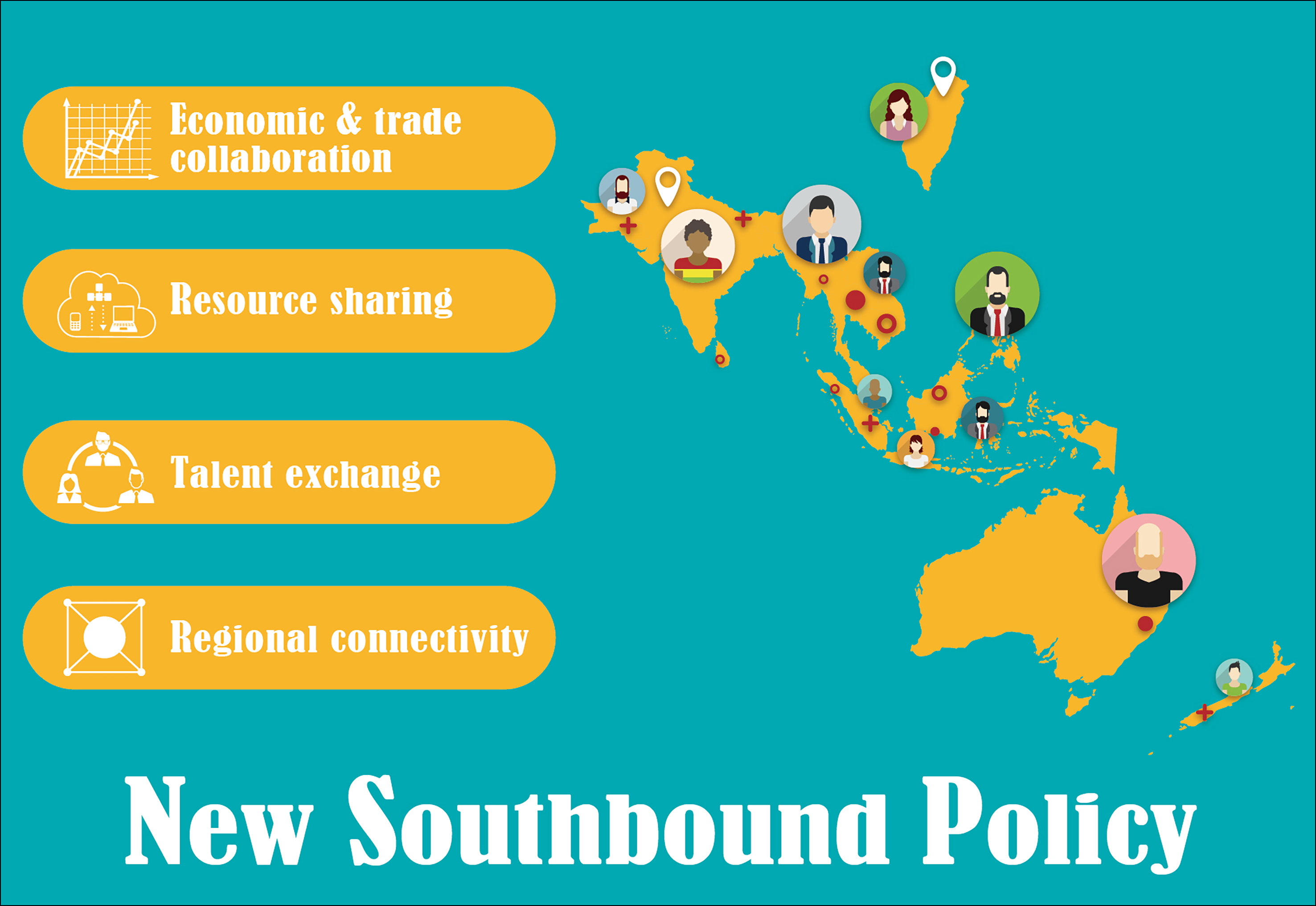 To diversify Taiwan's risks and minimize overdependence on any single market, the Executive Yuan on September 5, 2016 introduced the promotion plan for the New Southbound Policy to strengthen Taiwan's relations with its neighbors to the south, from South and Southeast Asia to Australia and New Zealand. The plan prescribes specific measures for four focal areas: economic and trade collaboration, talent exchange, resource sharing and regional connectivity. By pushing economic, technological and cultural exchanges, Taiwan hopes to share resources, talent and markets with those countries while creating a new and mutually beneficial model of cooperation. These efforts will in turn build a sense of economic community and enable Taiwan to integrate more fully into the regional economy.