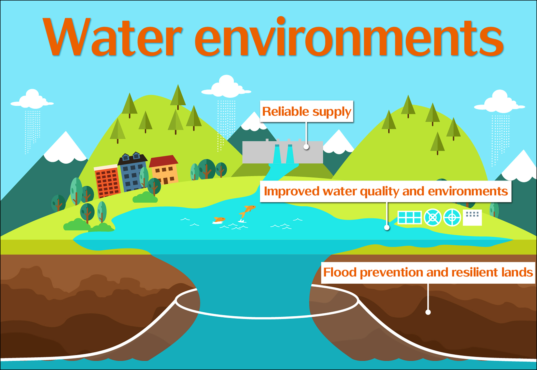 Flood control and prevention, resilient lands: Comprehensive improvement plans for river channels and regional drainage systems managed at the city or county level are being implemented. This includes flood prevention for flood-prone land and the construction of shore defenses, storm drains and agricultural run-off channels. The ability of urban areas to absorb and hold floodwaters, and the protection of aquaculture areas will also be enhanced.