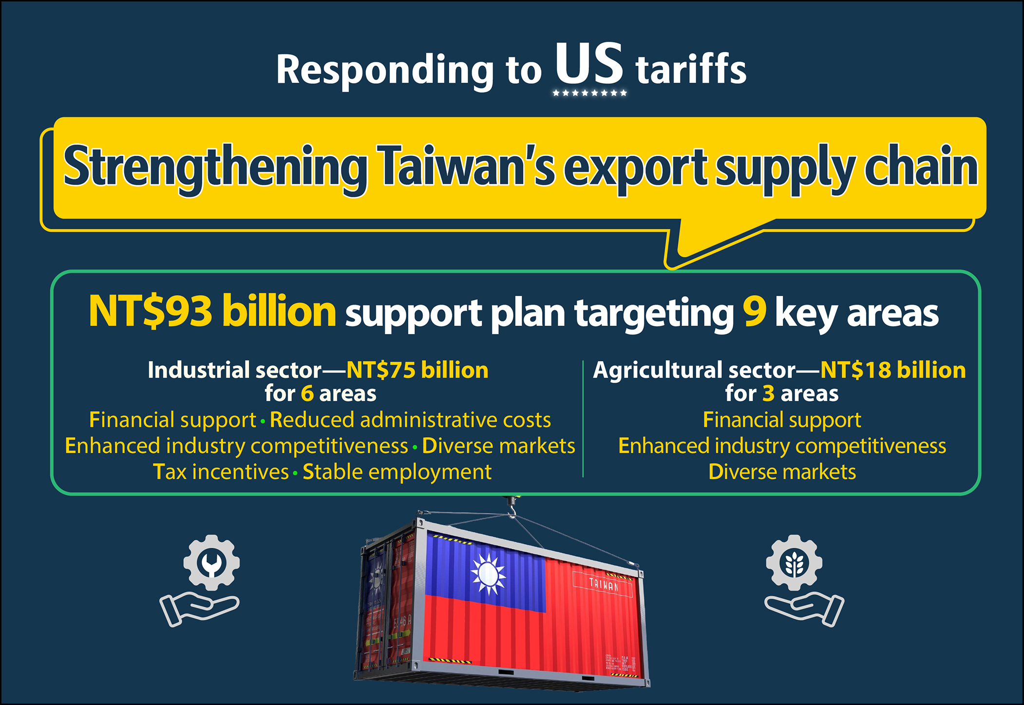 On April 2, 2025, U.S. President Donald Trump introduced steep tariffs on numerous countries, including Taiwan, with a 90-day pause on implementation subsequently announced on April 9. Responding swiftly, the Taiwanese government has launched an NT$93 billion (approximately US$3.1 billion) support plan that targets nine key areas covering both the industrial and agricultural sectors. The plan aims to help Taiwanese businesses and workers, including those in agriculture and fisheries, mitigate the impact of the tariff policy, while maintaining economic stability and industry development, so as to bolster public and industry confidence.
