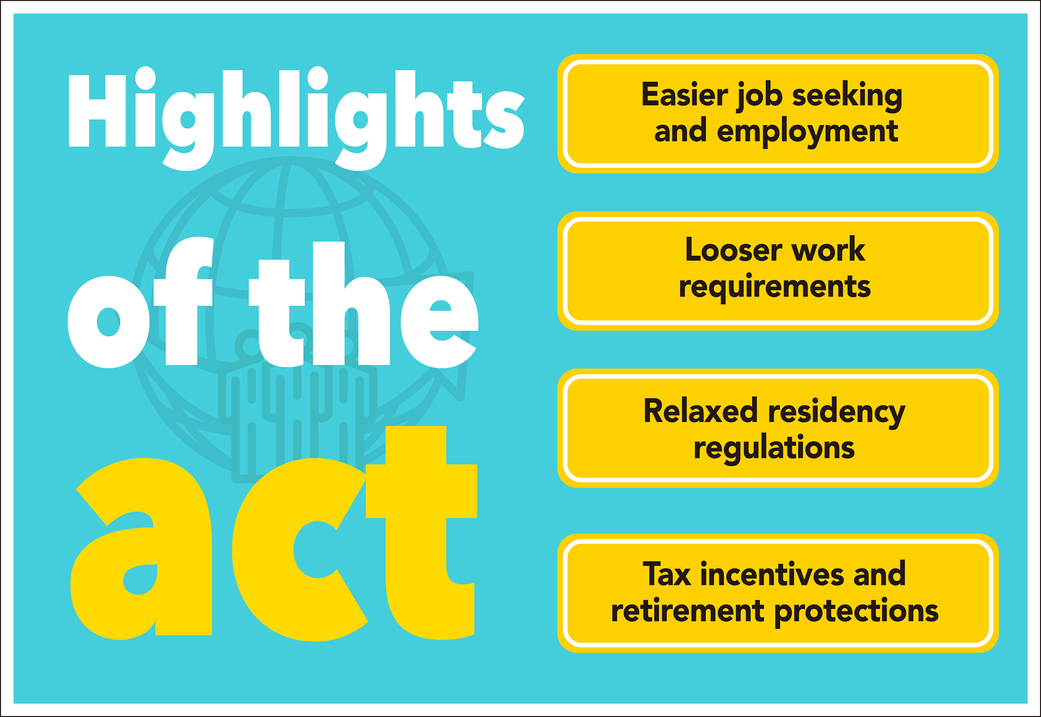 In October 2021, the government promulgated amendments to this act to boost Taiwan's ability to recruit and retain international talent. In addition to supporting the nation's "five plus two" innovative industries and the Six Core Strategic Industries, the changes are designed to meet urgent demands for talent and prepare for the effects of a repositioned post-pandemic global supply chain on the flow of international talent. Provisions include further easing work and residency regulations for foreign professionals and offering more tax incentives and social protections, all with the aim of allowing more foreign talent to come to and stay in Taiwan.