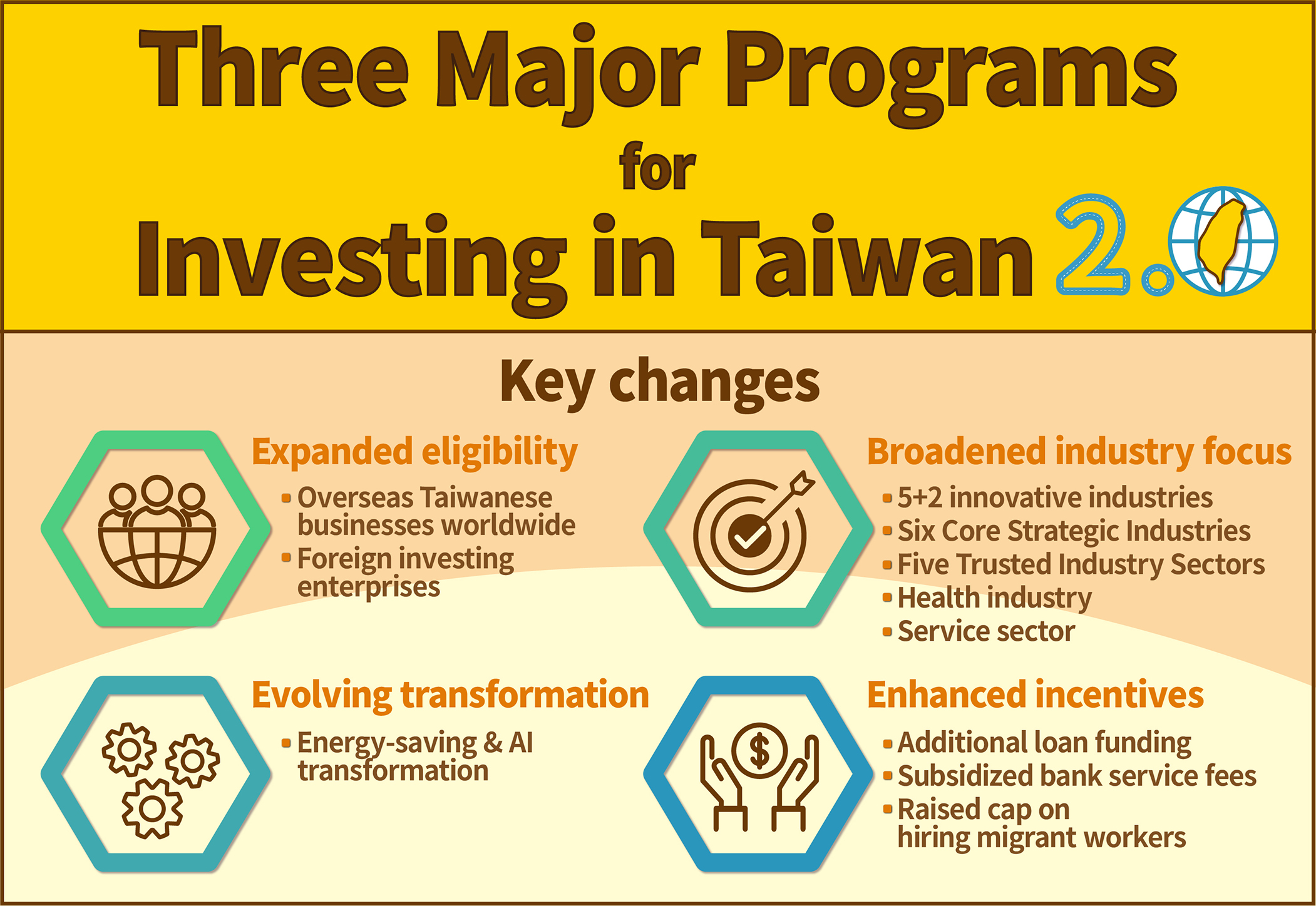 In response to the U.S.-China trade war, the government launched three major action plans in 2019: the Action Plan for Welcoming Overseas Taiwanese Businesses to Return to Invest in Taiwan, the Action Plan for Accelerated Investment by Domestic Corporations, and the Action Plan for Accelerated Investment by Small and Medium-sized Enterprises (SMEs). Collectively referred to as the Three Major Programs for Investing in Taiwan, these initiatives aim to support Taiwanese businesses in accelerating the reshoring of production and adapting to supply chain restructuring by offering a range of incentives in areas such as financing, land access, water and electricity supply, taxation and the employment of foreign workers. In light of current geopolitical risks—including U.S. tariff policies, the Russia-Ukraine war and rising tensions in the Middle East—as well as to strengthen the nation's economic momentum and help enterprises respond to shifting conditions and domestic labor shortages, the Executive Yuan has extended the programs through 2027, under the name Three Major Programs for Investing in Taiwan 2.0. In addition to expanded eligibility and enhanced incentives, the updated programs will also actively promote AI and green transformation across industries to build a resilient and trusted industry chain, aiming to attract an additional NT$1.2 trillion (approximately US$40.8 billion) in investment and create 80,000 new Taiwanese jobs.