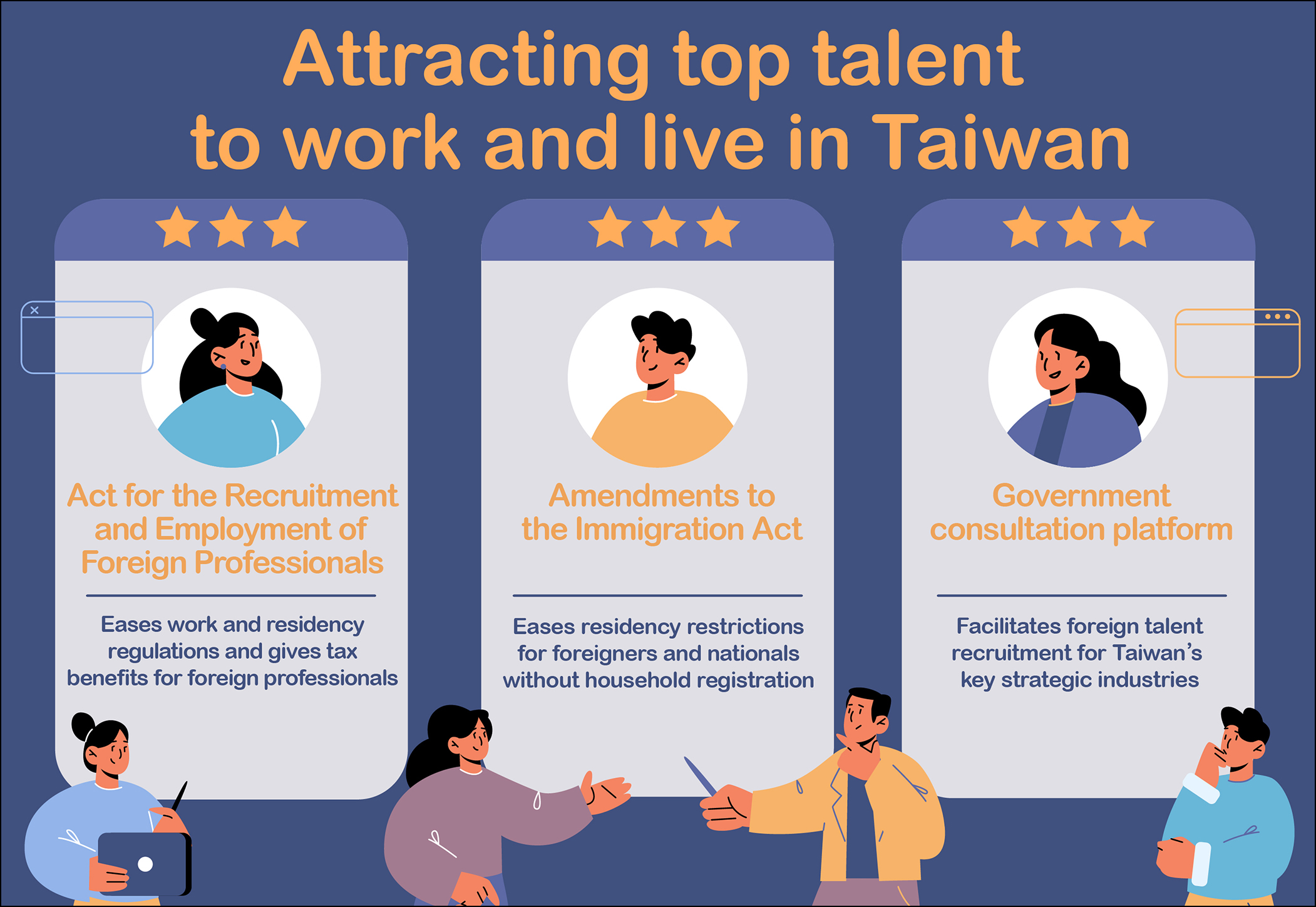 Improving tax incentives and social protections: Foreign special professionals coming to Taiwan for the first time will receive special tax exemptions for their first five years of employment, up from three years previously, and can qualify for expanded coverage under the national pension and national health insurance systems.