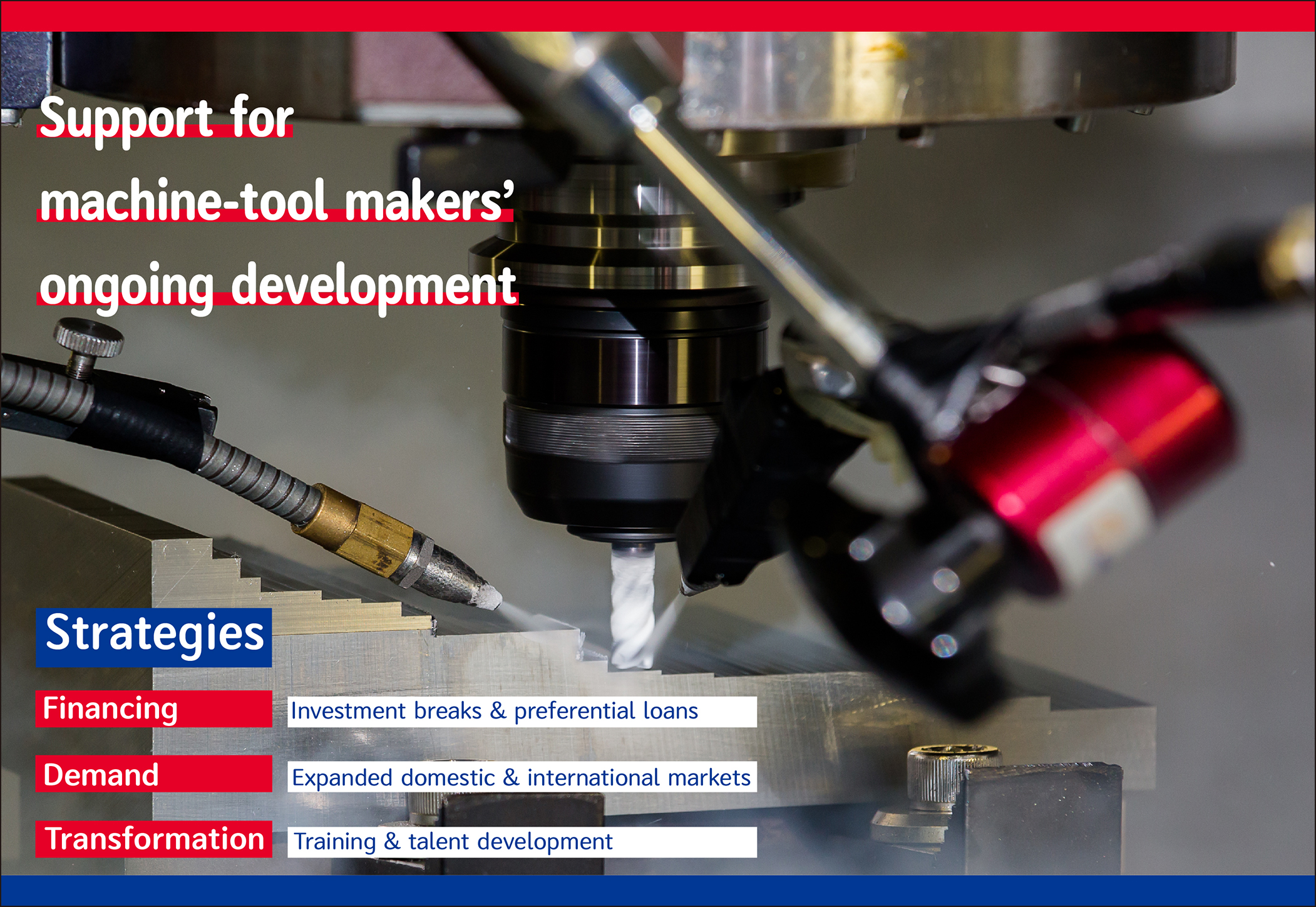 ◆ Greater demand: Domestic market demand will be boosted by encouraging the public and private sectors to replace older equipment and attracting new investment from returning China-based businesses. On the international front, the government and manufacturers are stepping up the organization of a Taiwan machinery purchasers alliance, opening strategically placed business centers to clear channels in overseas markets, taking advantage of opportunities presented by the relocation of secondary production facilities to New Southbound countries, and inviting overseas purchasers groups to Taiwan.