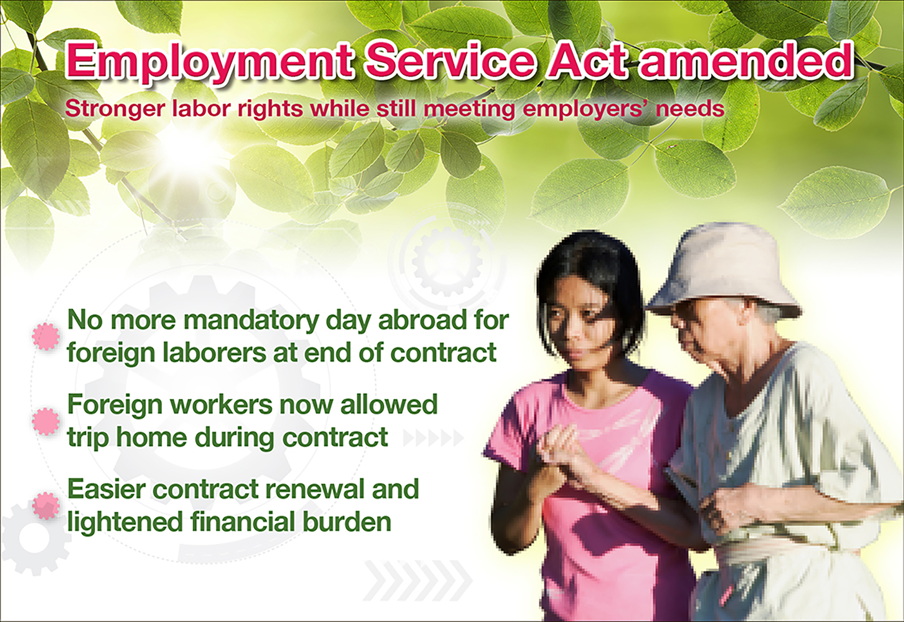 After amending the current Act, the importation of foreign laborers remains a strategy designed to supplement the domestic labor market, and will not impact the rights of domestic laborers. The amendments will, however, simplify labor contract renewal procedures, reduce employee absences due to previous exit requirements, make manpower deployment more flexible, and reduce the financial burden imposed on laborers by foreign brokers. These moves will strengthen the employment rights of foreign laborers in Taiwan and enhance the nation's international image.