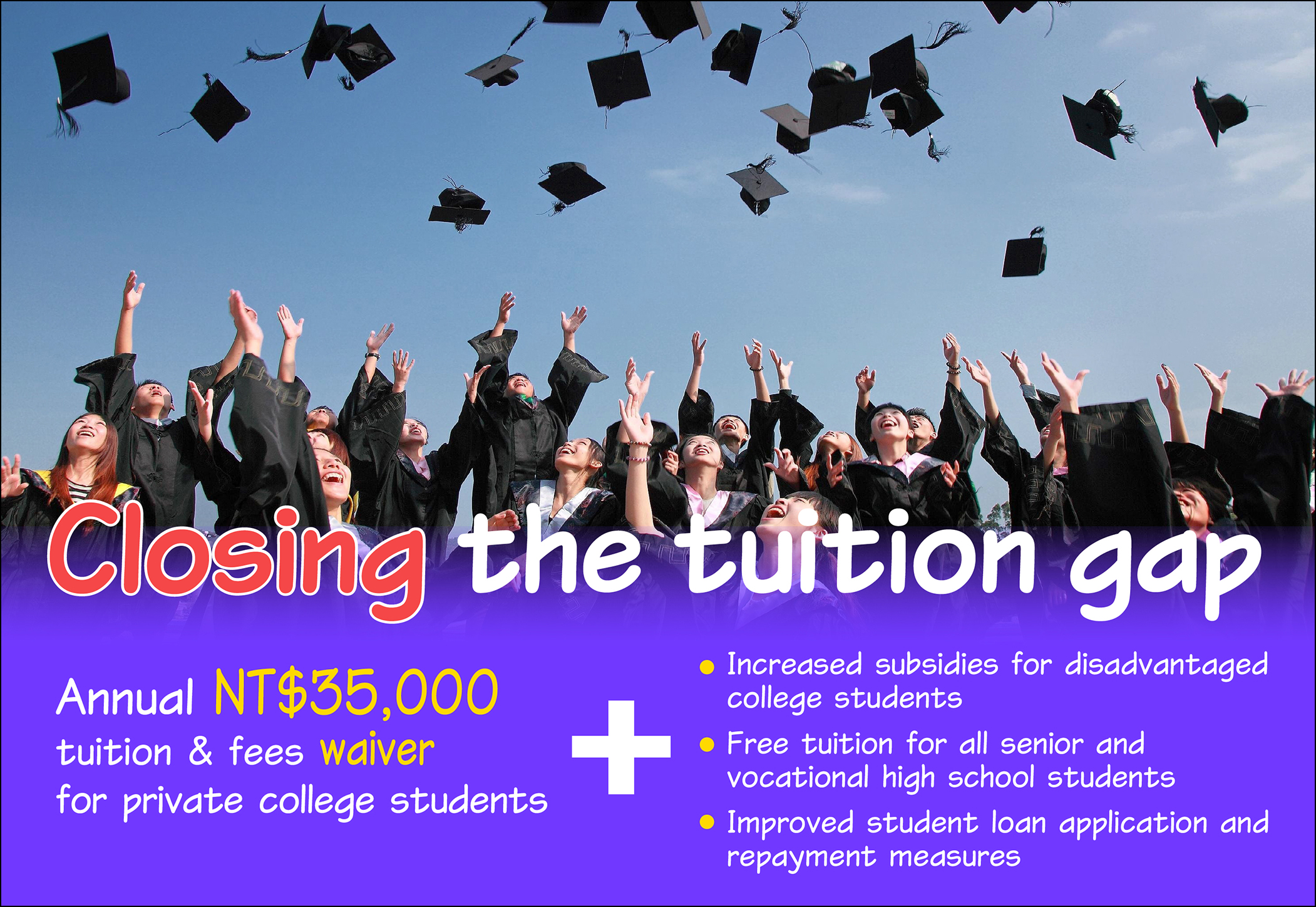 ■ Fixed-sum waiver to alleviate public-private tuition and fees gap: The annual cost of tuition and other fees at private universities and colleges is on average NT$50,000 (US$1,613) higher per student than at equivalent public educational institutions. To alleviate this discrepancy, undergraduates studying at private universities and colleges (including five-year junior college students in the final two years of their studies) will qualify for a waiver of NT$35,000 (US$1,129) per annum against the cost of tuition and other fees, thereby expanding the level of care for students in tertiary education aged 18 to 22.