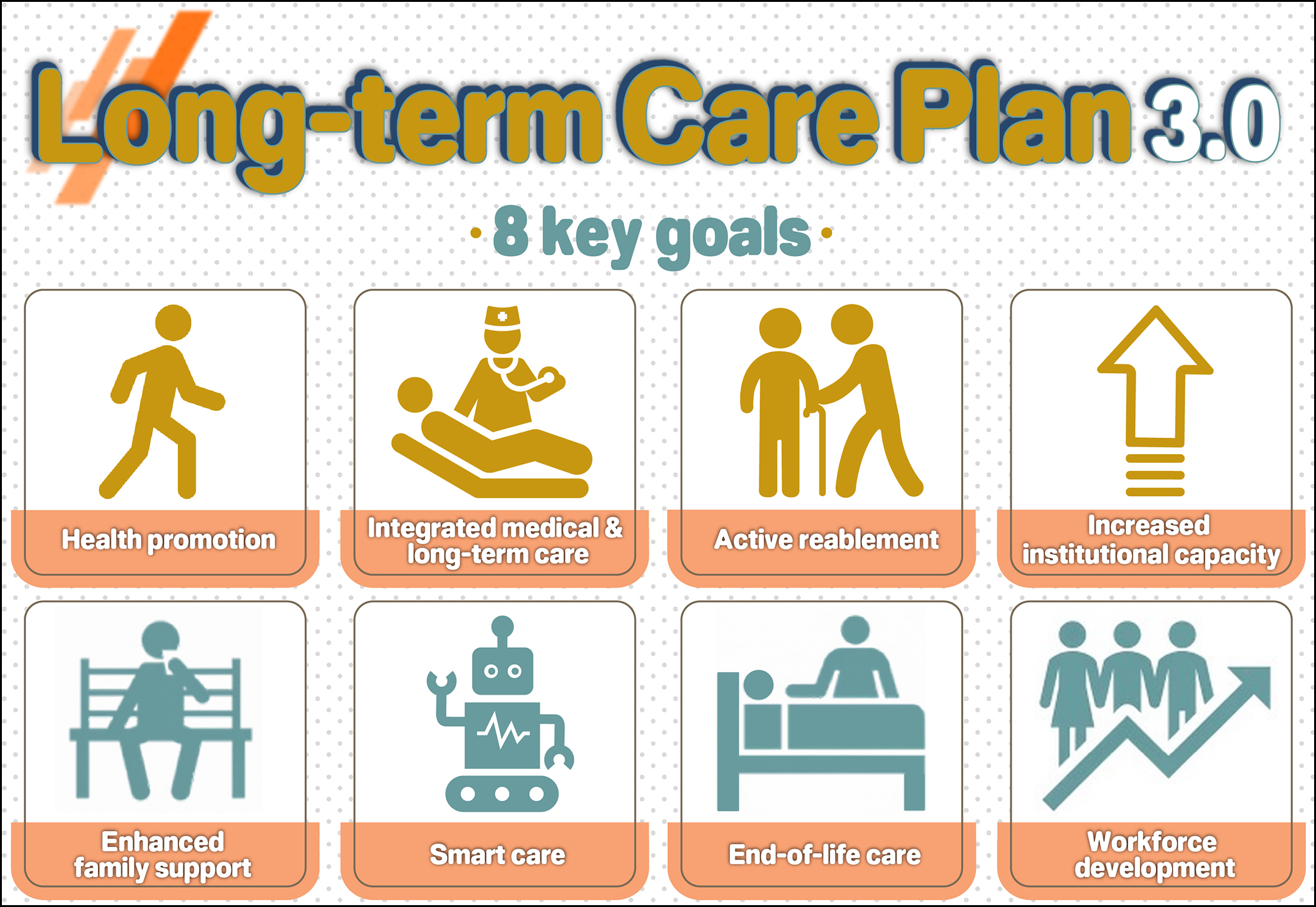 ■ Health promotion: Foster inclusive community-based care networks, and expand grassroots service points and various long-term care resources. Support community development through multiple channels, and integrate preventive care, active aging and interventions to delay disability and dementia into the care system.