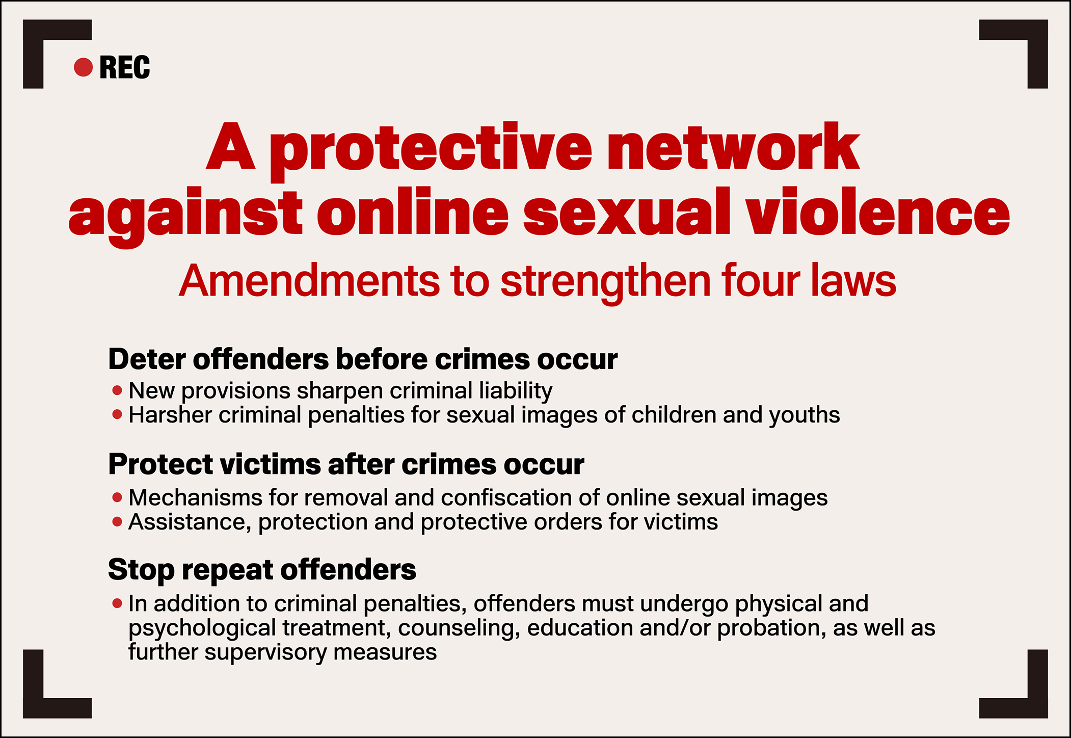 The technological progress and widespread use of the internet have given rise to new forms of activity involving illegal use of personal images that cause serious harm to people's privacy, security and personal dignity. Starting from the perspective of victims' needs, the government is responding with amendments to four laws tackling sexual violence crimes—the Criminal Code of the Republic of China, Crime Victim Protection Act, Sexual Assault Crime Prevention Act, and Child and Youth Sexual Exploitation Prevention Act. These amendments add a chapter dedicated to expanded protections, increase criminal liability, provide relevant assistance to victims, and enact related complementary measures to build a comprehensive protective network that more effectively prevents gender-based violence crimes.