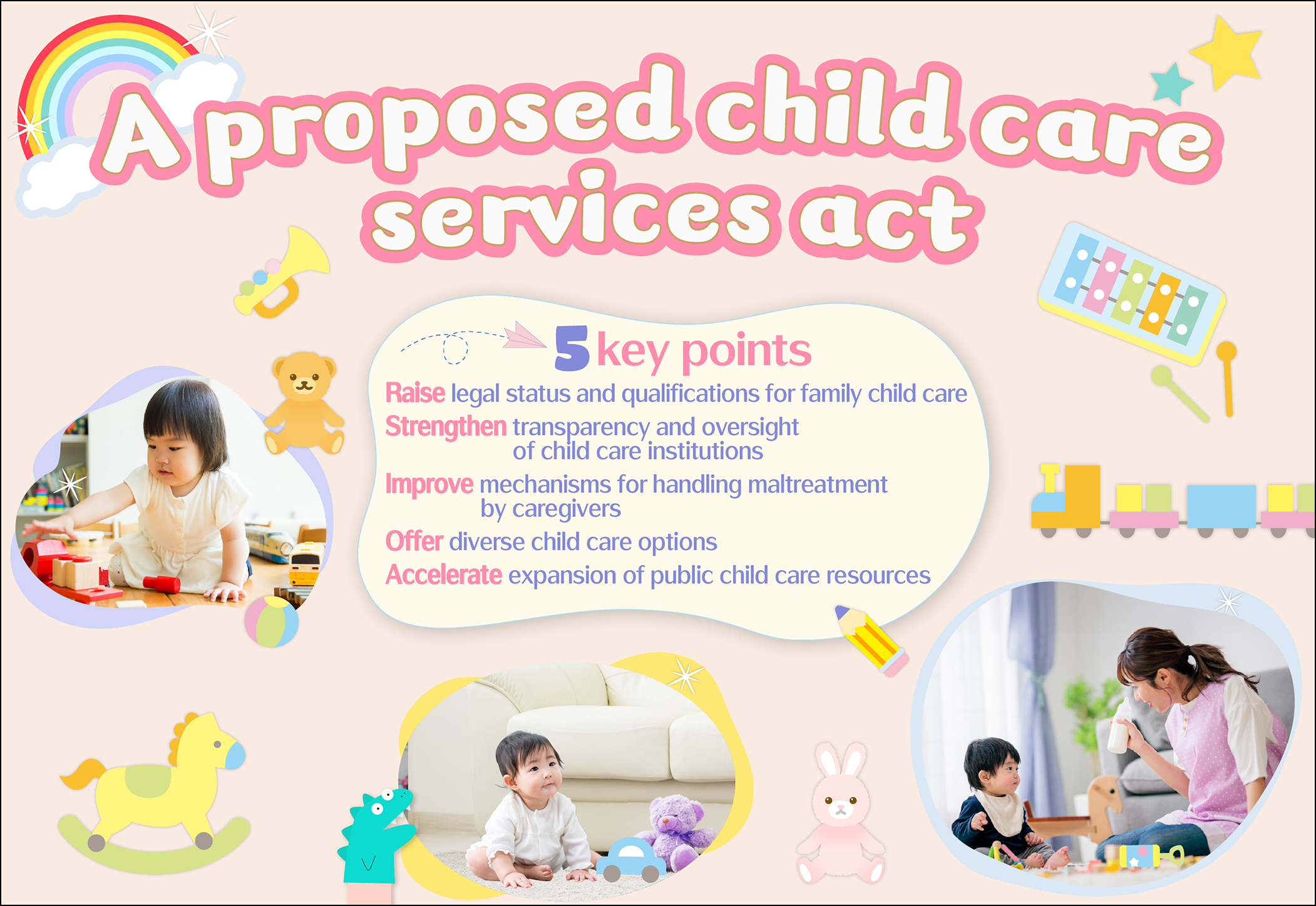 On May 8, 2025, the Executive Yuan approved a draft bill for a new child care services act that will help safeguard children's access to age- and developmentally appropriate care. The proposed legislation aims to enhance the regulatory and guidance mechanisms for child care services for children aged 0 to under 2, thus better protecting the rights and interests of children in care and their families.
