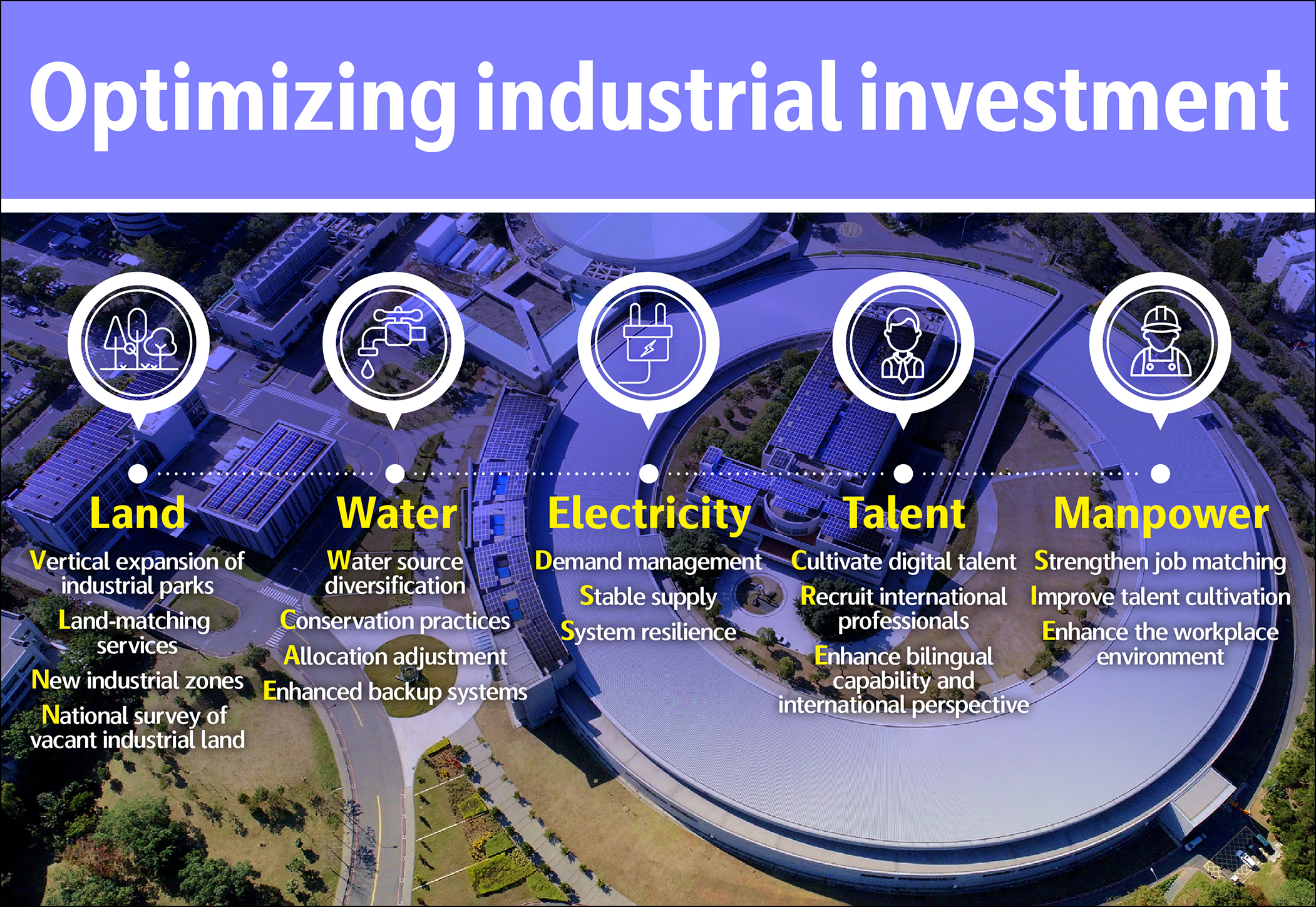 To respond to rapid changes in the domestic and global economies and to address the development needs of newly emerging strategic industries, on December 7, 2021 the Executive Yuan approved a policy designed to optimize five major factors relating to industrial investment for the period 2021-2024, with the goals of creating a favorable business environment and laying solid foundations for the nation's future industrial development. Since the policy's introduction, significant progress has been made. The domestic investment environment is now more favorable and competitive than before, which has helped Taiwan to successfully navigate various threats such as the COVID-19 pandemic, Russia-Ukraine war, a severe drought, shortages in raw materials and manpower, high inflation and rising construction costs. Furthermore, Taiwan's enhanced investment climate is projected to be able to meet the future development needs of the nation's key industries.