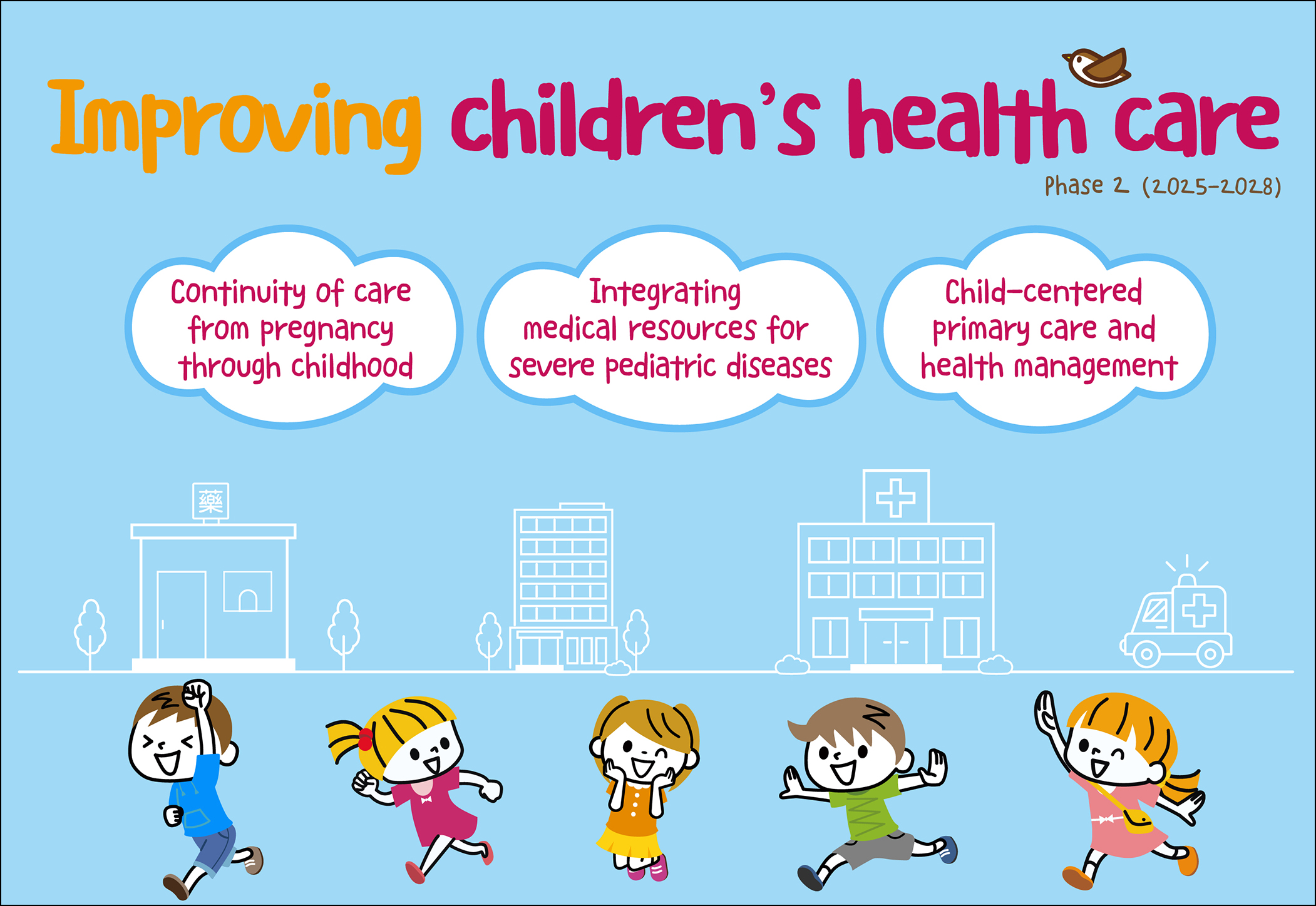 To protect children's health, since 2021 the government has promoted the first phase of a children's health care improvement program (2021-2024), allocating NT$2.8 billion (US$85.3 million) to enhance perinatal and pediatric emergency and critical care, as well as to strengthen pediatric primary care and health management. The second phase of this program (2025-2028) will allocate NT$13.5 billion (US$411.1 million) to implement a ranking system for major hospitals based on their ability to provide perinatal and pediatric critical care; improve personnel capacity and retention of relevant medical specialists; and deliver better integrated health care services for children.