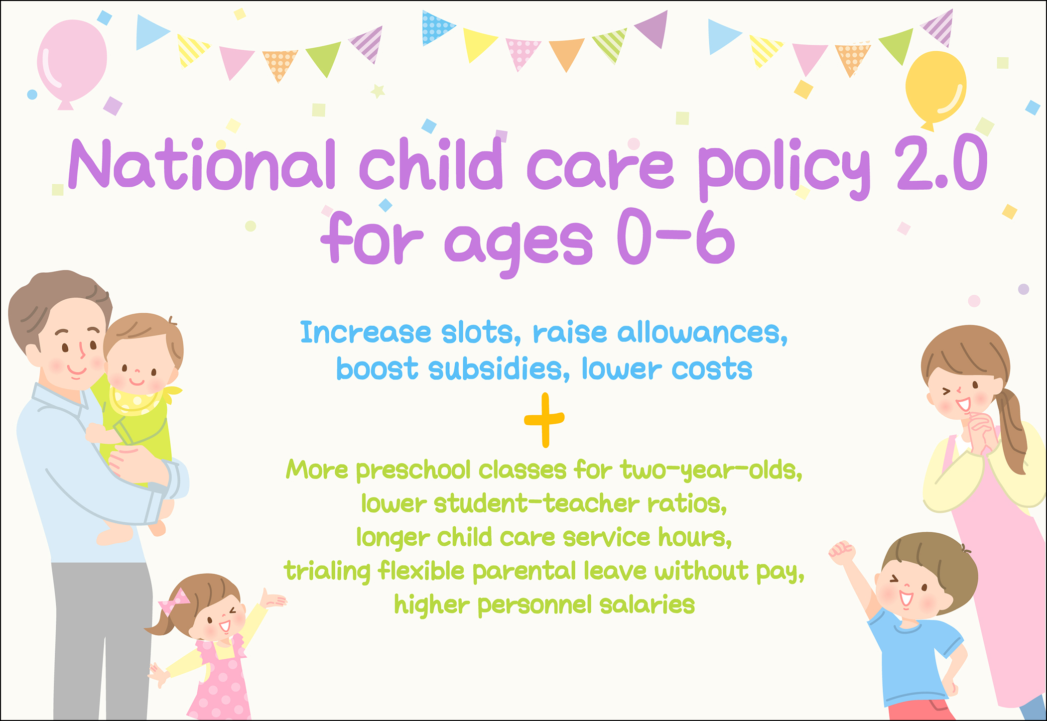 Since July 2018, the government has promoted an array of measures to counter declining birth rates, and in 2024 it launched version 2.0 of its national child care policy for children ages 0-6. This policy implements various upgraded measures such as enlarging affordable education and care service capacities, increasing child care subsidies, creating more preschool classes dedicated to enrolling two-year-olds, continuing to grant childrearing allowances, reducing preschool student-teacher ratios, trialing flexible parental leave without pay, and raising salaries for child care and education personnel. Through all these measures, the government is throwing its full support behind childrearing households, giving young people the confidence to marry and start a family.