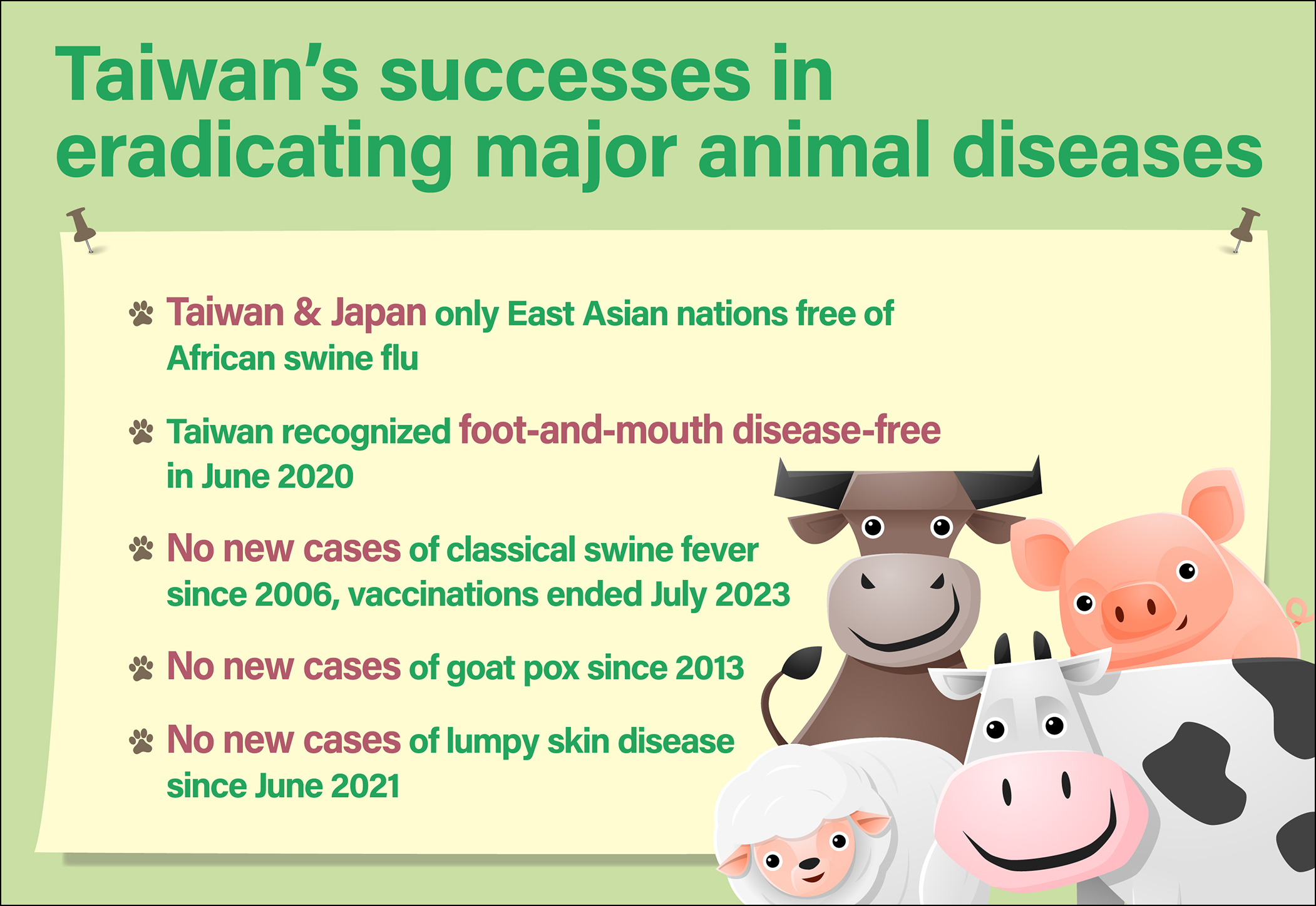 In addition to successfully preventing FMD and ASF epidemics, Taiwan has recorded no cases of goat pox for more than 10 years and recorded the last case of lumpy skin disease within cattle in June 2021. The nation continues to make great progress toward ending vaccinations for classical swine fever (CSF) and goat pox, and being classified as a free zone for both diseases by WOAH. Once Taiwan achieves these goals, it will become one of a select few countries in the world that is free from FMD, ASF and CSF. Meanwhile, the government is promoting the modernization of hog farming equipment, expediting the establishment of cold chain facilities and actively seeking out export markets for poultry and livestock products, to ensure that Taiwan's animal husbandry industry continues to go from strength to strength.
