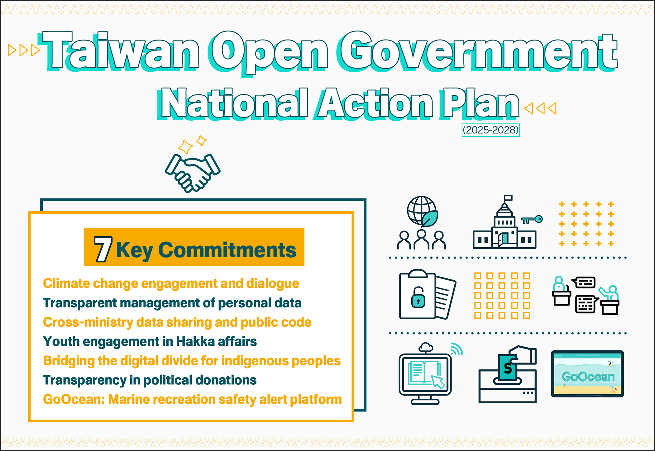 Transparency, accountability and participation are the central values of "open government," as outlined by the international Open Government Partnership initiative. From 2021 to 2024, Taiwan's first Open Government National Action Plan delivered progress on this front and laid a solid foundation. Now, the government has launched the next stage of the action plan for 2025 to 2028, strengthening democracy through public-private cooperation mechanisms, deepening its focus on challenges in five major areas—environment and climate, digital governance, inclusion, anti-corruption, and information access—and introducing seven key commitments. The action plan seeks to address both global trends and domestic needs, enhance digital technology applications, expand diverse civic participation opportunities and increase policy transparency, thus positioning Taiwan as a reliable partner in the international community.