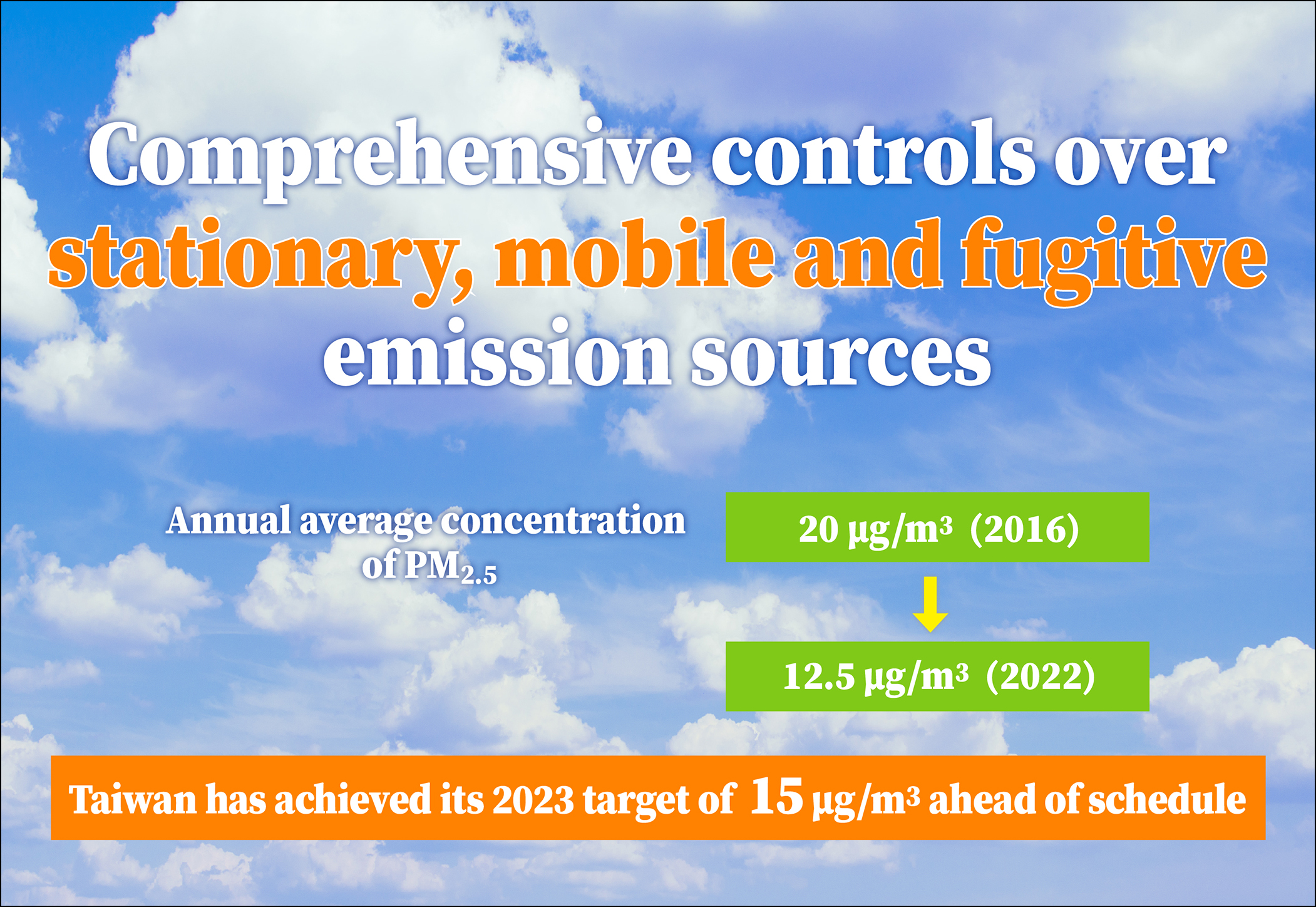 As part of a comprehensive remedy to the air quality problem, the government introduced an air pollution control strategy and an air pollution control action plan in 2017, as well as amendments to the Air Pollution Control Act in 2018. To continue and expand on these efforts, the government launched a new air pollution control plan (2020-2023) to curb pollution at all points along its origin, from preventing its formation to implementing end-of-pipe technologies. The plan has better safeguarded the public's health by achieving the goal of an annual average PM2.5 concentration of 15 μg/m3 or less across Taiwan by 2023, as well as reducing emissions of volatile organic compounds to alleviate ground-level ozone pollution.