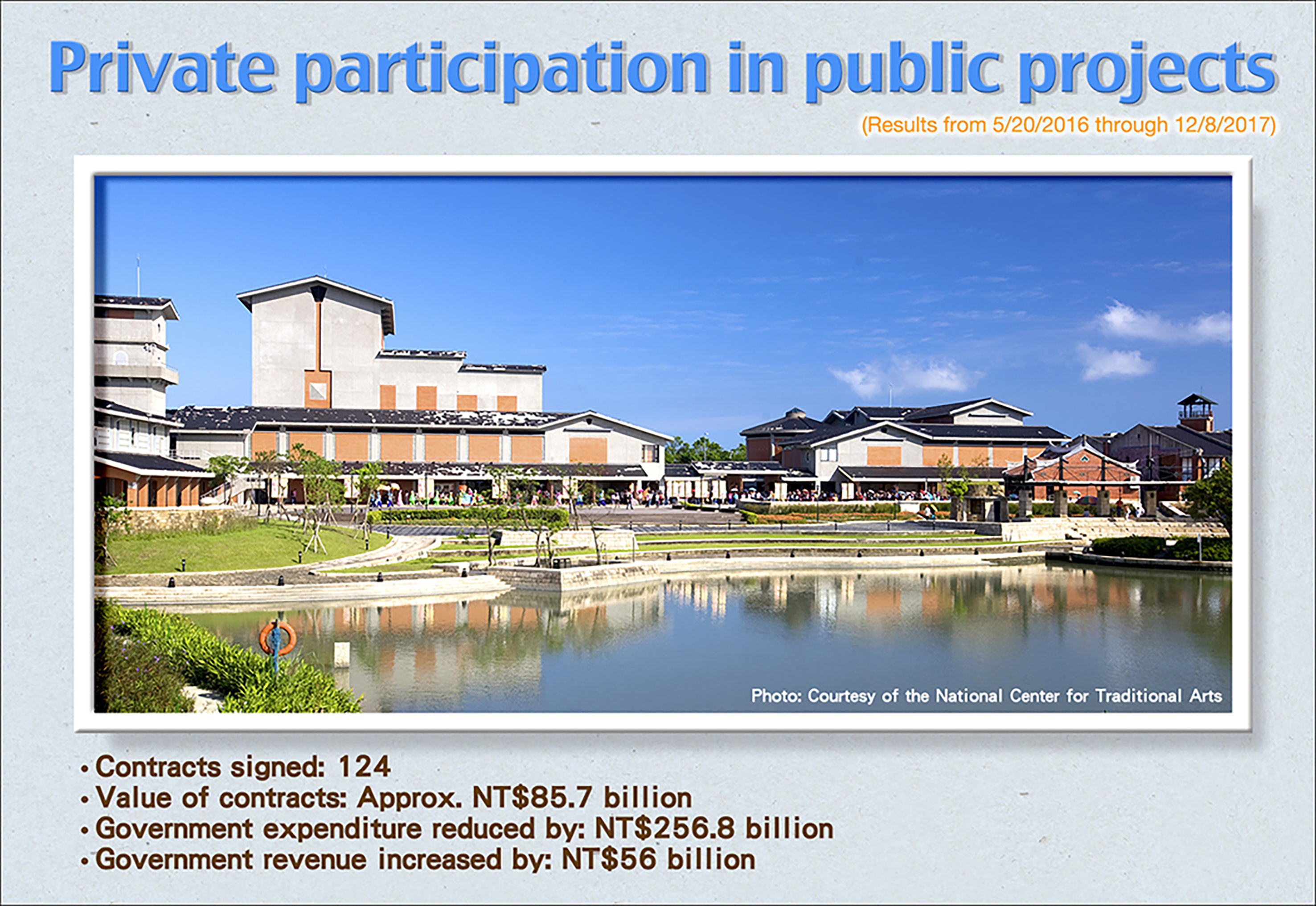 Government resources are limited but the strength of the private sector is unbounded. Infusing private-sector resources into public infrastructure not only reduces public expenditures and enhances government services, but also accelerates socioeconomic development while achieving winning outcomes for government, businesses and the people of Taiwan.