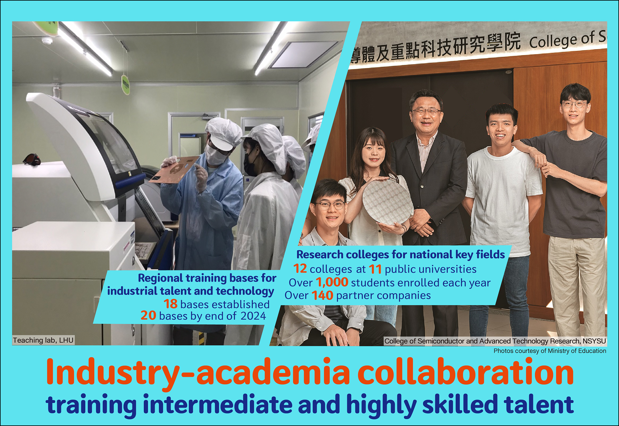 To keep pace with economic and technological changes, the government is engaged in ongoing collaborations with industry, academia and research institutions to cultivate mid-level and high-level skilled talent to promote the development of fields of critical national interest and enhance Taiwan's industrial competitiveness.