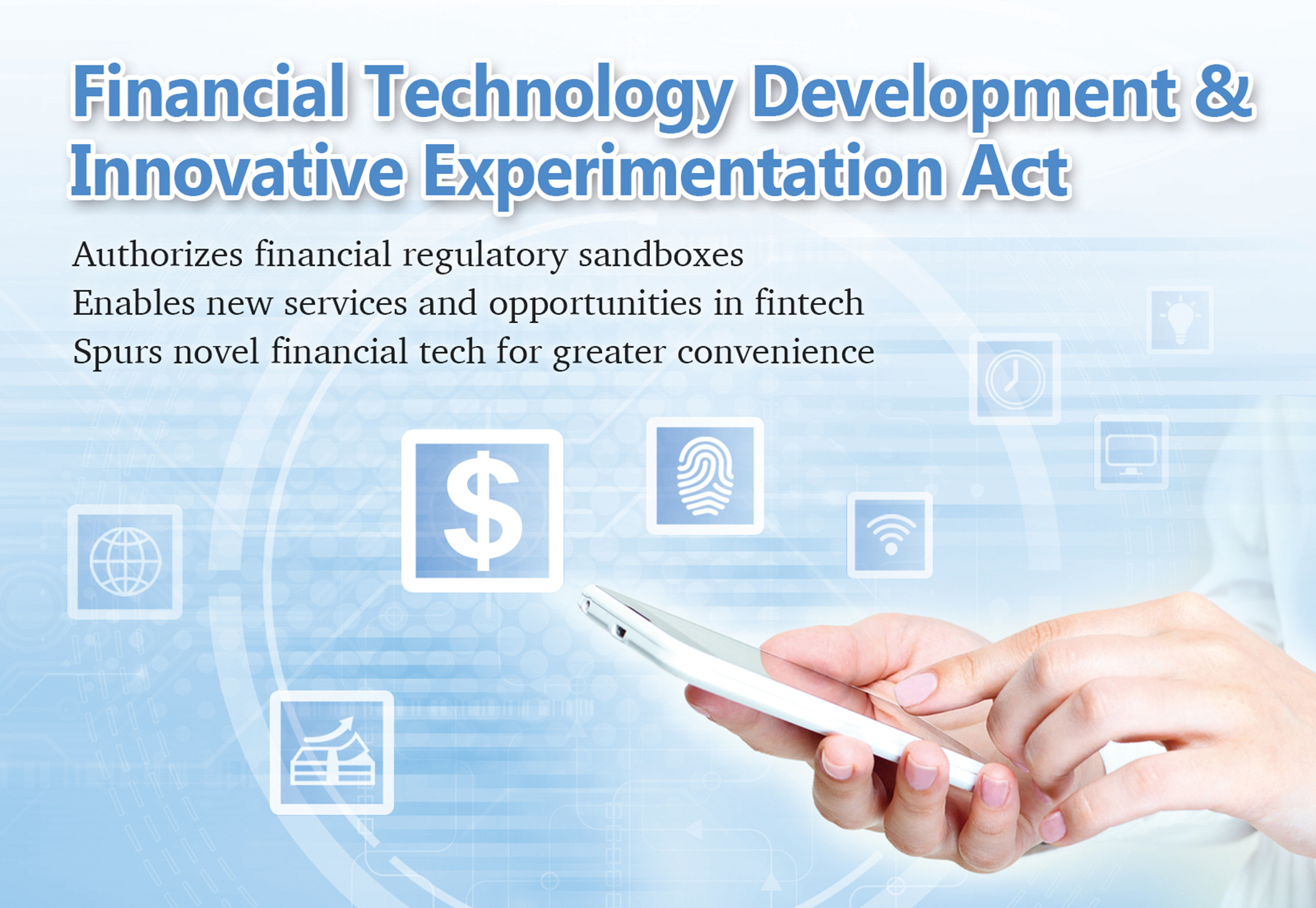Innovative experimentation with new financial technology is conducted within a framework of regulations that is known as a financial regulatory sandbox. Taiwan is the first country in the world to enact legislation specifically establishing such a framework. This mechanism for innovative experimentation avoids the pitfalls of regulatory infractions as operators pursue more rapid development of fintech services that will enhance Taiwan's financial competitiveness. At the same time, measures are in place to protect consumer rights and maintain market order, with an emphasis on responsible innovation.