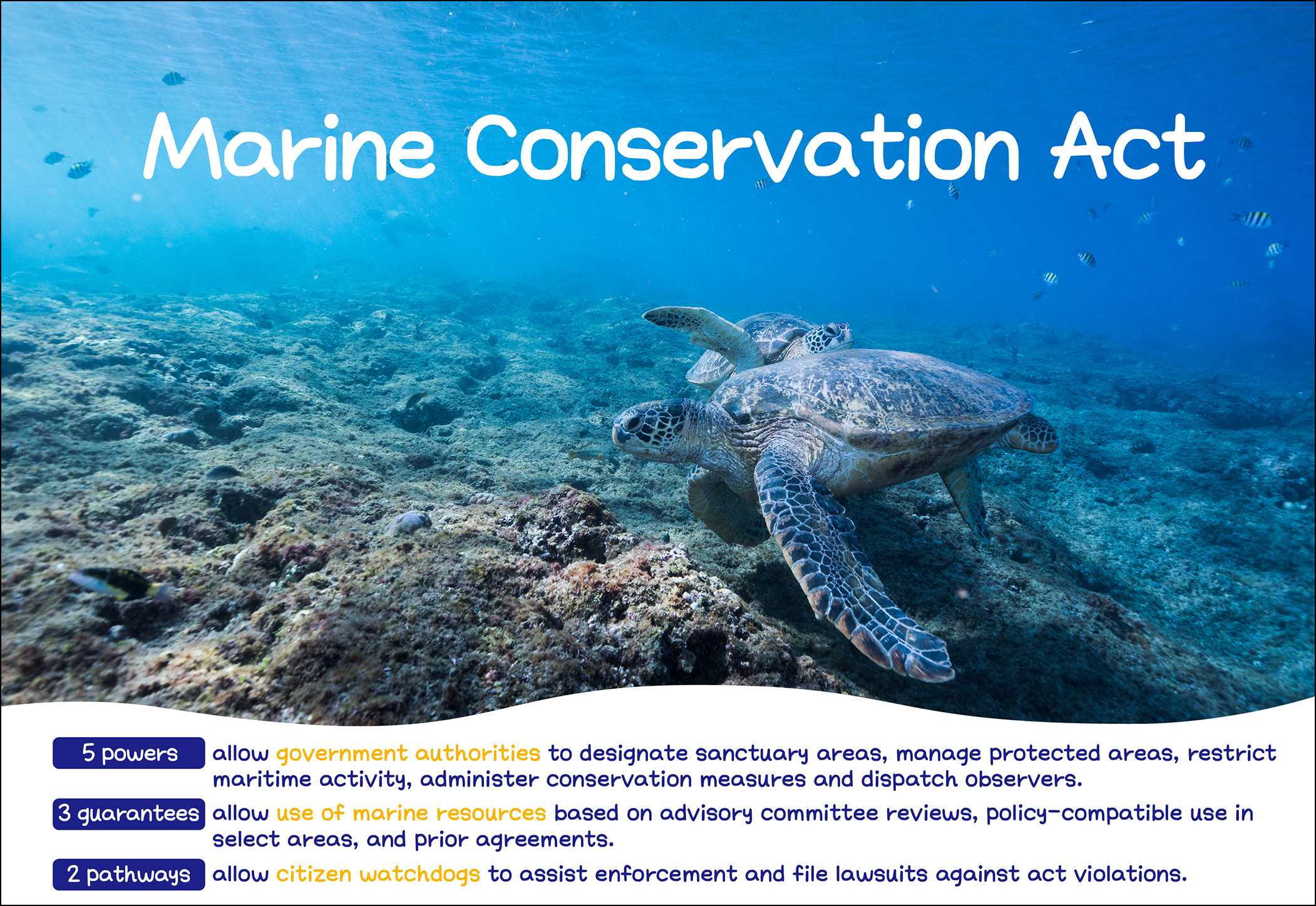 ■ Five powers: The act grants powers to managing government authorities to (1) designate sanctuary areas wherever special protections are necessary for the marine ecosystem; (2) determine overall policy guidelines for MPA management to ensure proper administration of protected areas; (3) declare restrictions and prohibitions on marine recreation, ship navigation, use of fishing equipment, and other maritime activities; (4) study and implement measures related to marine conservation and restoration; and (5) dispatch observers to survey, monitor and collect maritime data.