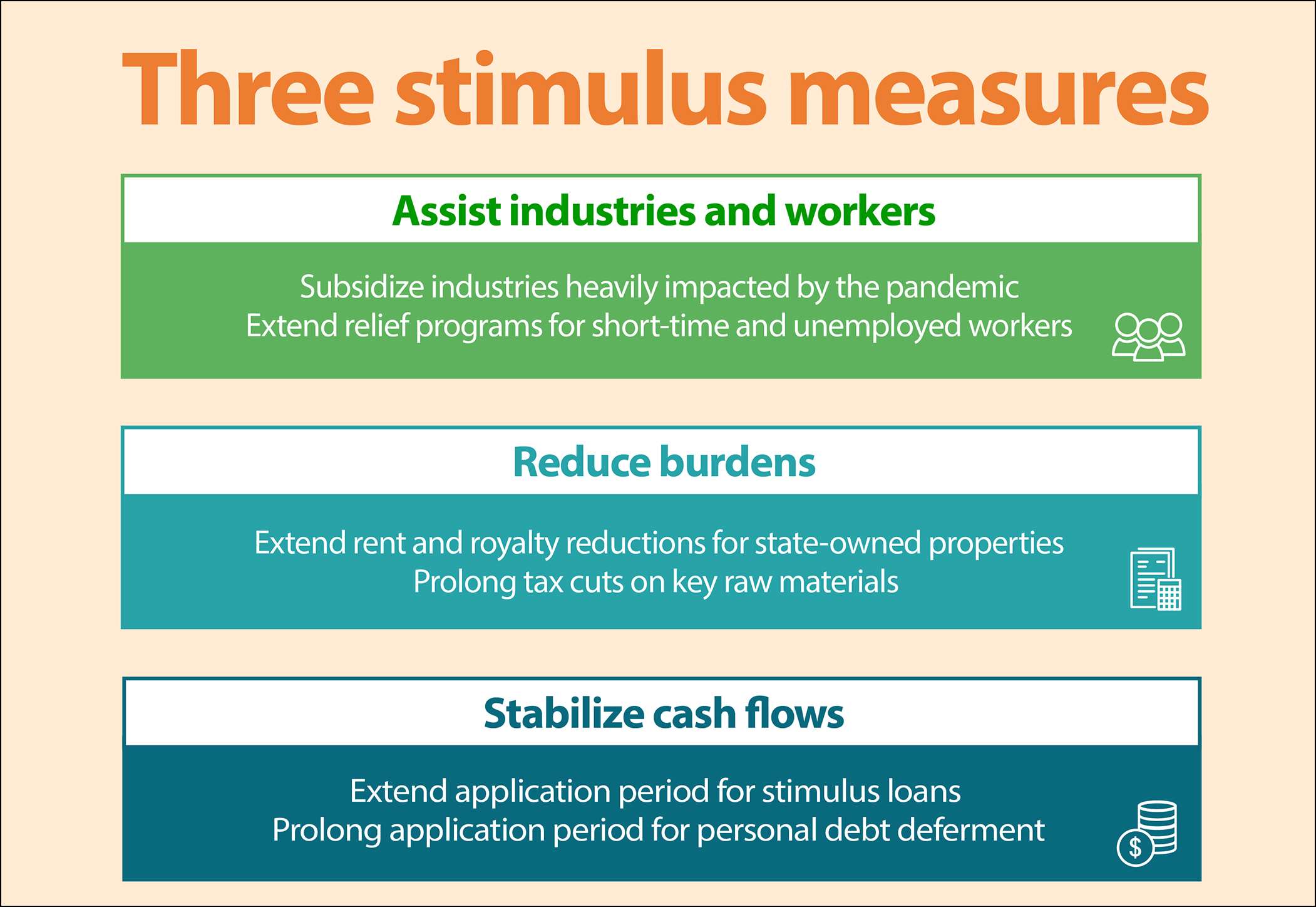 ■ Stabilize cash flows: Extend measures such as stimulus loans for small and medium-sized enterprises (SMEs) and non-SMEs impacted by the pandemic, as well as loan interest subsidies for tourism businesses, large arts and cultural companies, and performance groups. Prolong until June 2023 the period for bank customers to apply for three-to-six month deferments on credit card and personal loan payments.