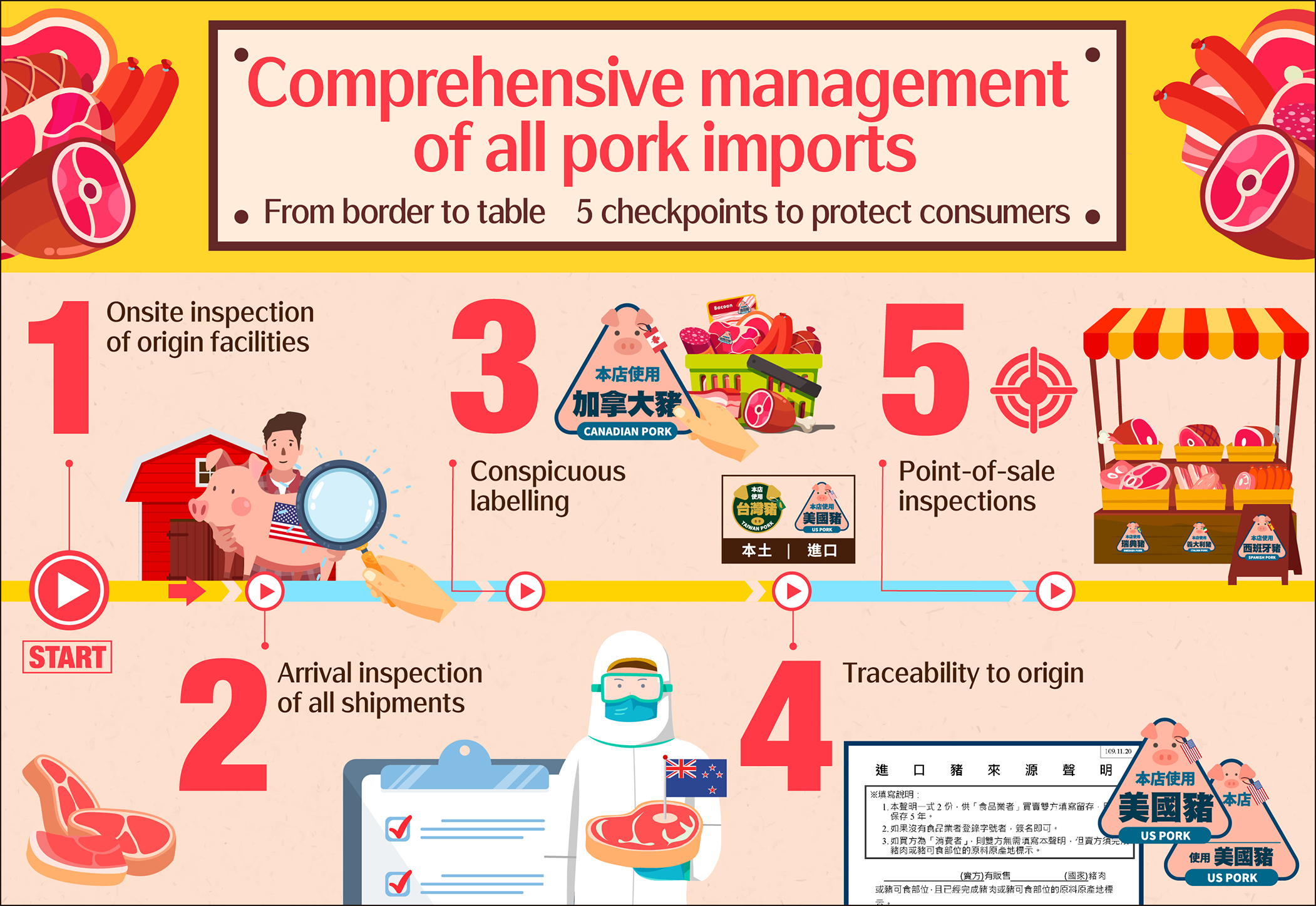 Five specific management protocols have been adopted to guarantee food safety. Pork processors in the U.S. that have not previously exported to Taiwan must first undergo onsite inspection by Taiwan officials before being eligible. Additionally, imports of pork products are now subject to shipment-by-shipment inspection at the border. Pork product manufacturers must clearly indicate the origin of pork used in a manner easily distinguishable by the public, while importers must provide country-of-origin labelling and import origin statements to facilitate food traceability. Finally, enhanced inspections will be conducted and overseen on a special-case basis.