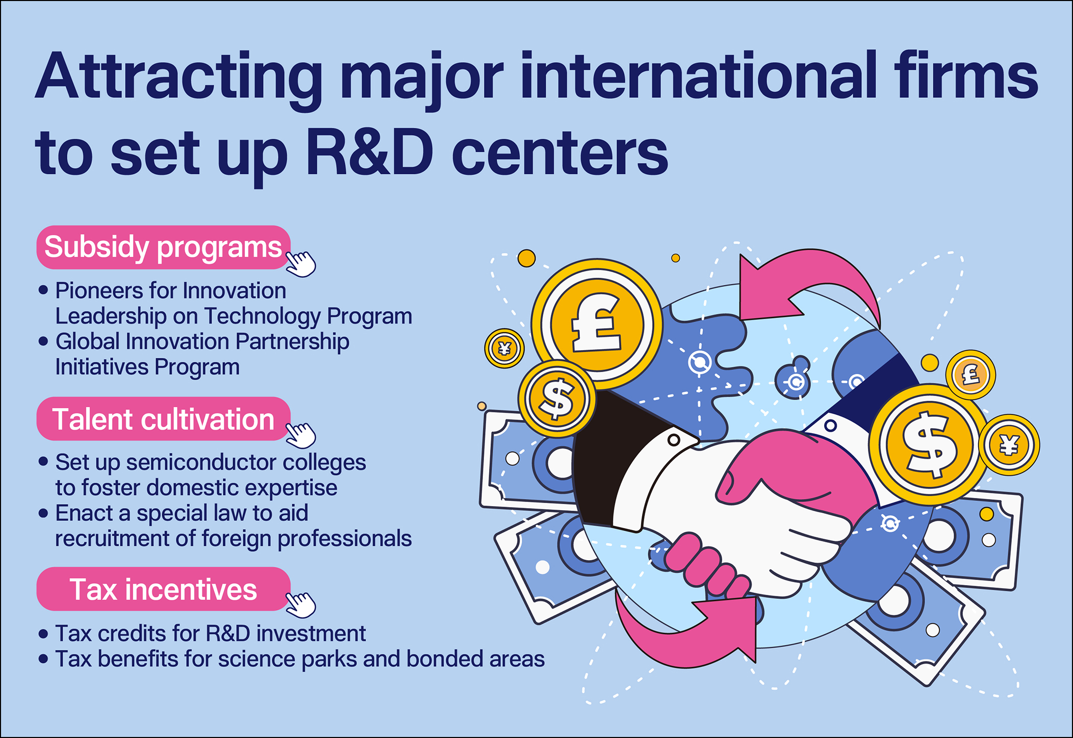 ■ Strengthen talent cultivation: Establish colleges for the study of semiconductor technology and other fields of national interest to foster a highly skilled science and technology workforce. Implement the Act for the Recruitment and Employment of Foreign Professionals that provides specialist workers with a four-in-one Employment Gold Card that combines work permit, residence visa, Alien Resident Certificate and re-entry permit.