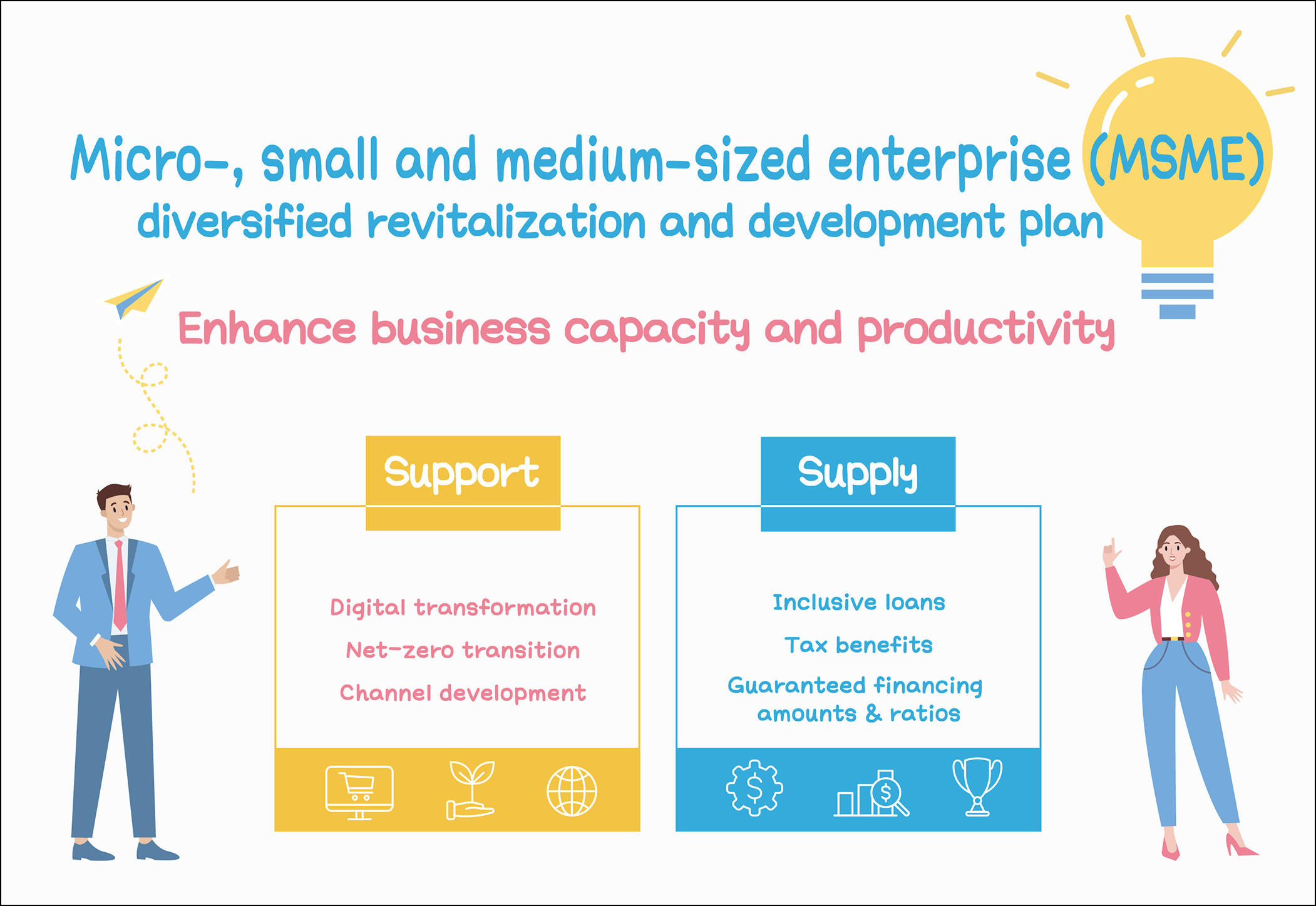 ■ Digital transformation: Provide free online courses and facilitate introduction of digital software. Smoothen the AI transformation of the service industry, promote AI applications in the manufacturing industry and offer customized assistance to companies according to their AI capabilities.