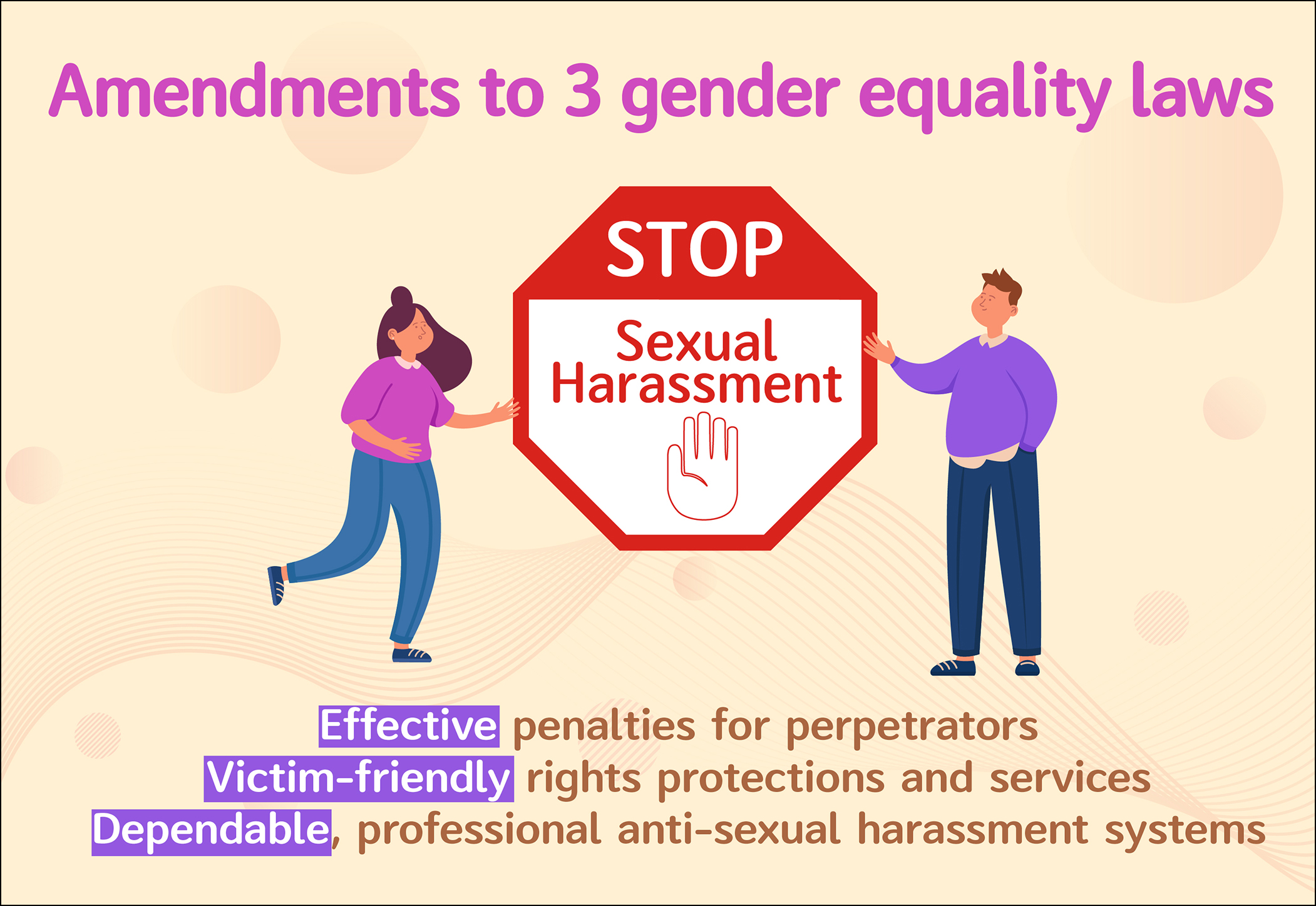In recent months, numerous accounts of sexual harassment from all walks of society have driven the growing Me Too movement in Taiwan. The Executive Yuan responded by approving draft amendments to the Sexual Harassment Prevention Act, Gender Equality in Employment Act, and Gender Equity Education Act, which subsequently passed their third and final readings in late July 2023 in the Legislative Yuan. Placing the protection of victims front and center, the amendments aim to impose effective penalties for perpetrators; create comprehensive, victim-friendly rights protections and services; and establish dependable, professional systems to combat sexual harassment.