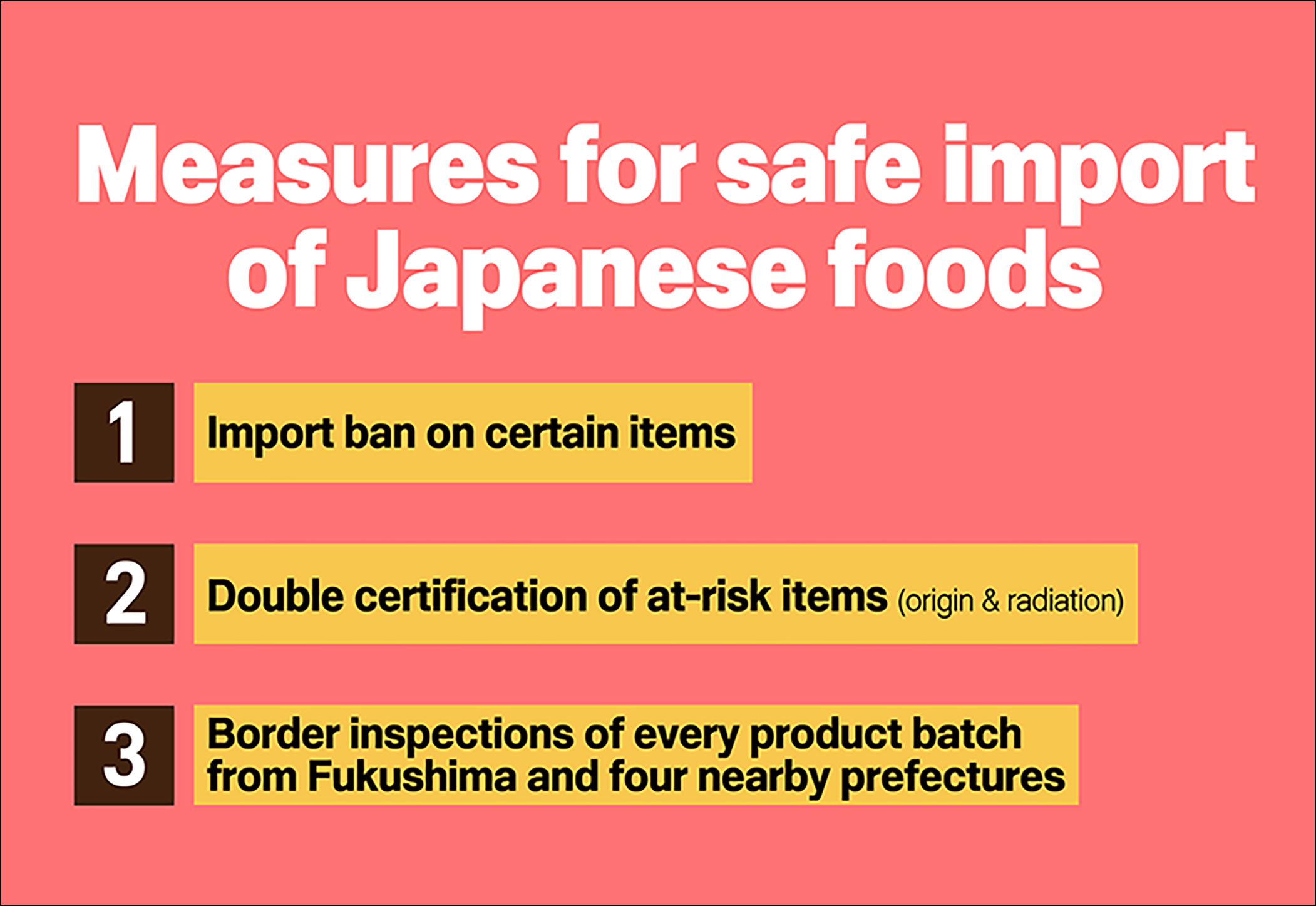 ■ Border inspections for radiation: Radiation inspections are conducted on each batch of food products from Fukushima and the four nearby prefectures. Inspections are also carried out with frequency adjusted according to risk level for nine categories of Japanese products—fresh fruits and vegetables, frozen fruits and vegetables, fresh aquatic products, frozen aquatic products, dairy products, baby food products, mineral water or drinking water, seaweed products and tea—in addition to random sampling inspections of other food products.