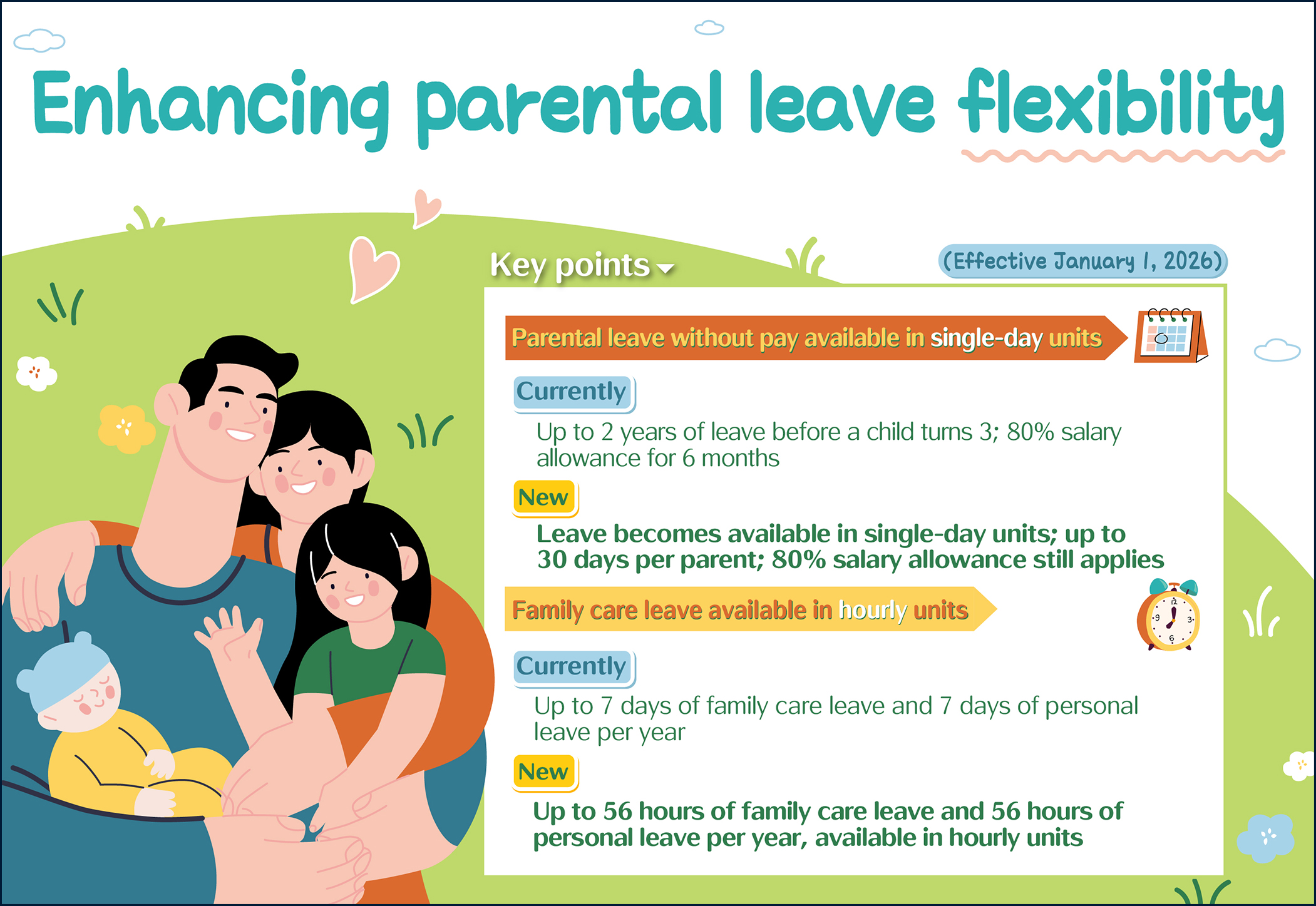 ■ Parental leave without pay available in single-day units: Under current regulations, employees can apply for up to two years of parental leave without pay before their child turns three, during which the government provides an allowance equal to 80% of their salary for up to six months. Starting in 2026, they will be able to apply for up to 30 days of such leave in single-day units within the approved allowance period. Both parents combined may take up to 60 days in total and remain eligible for the allowance.
