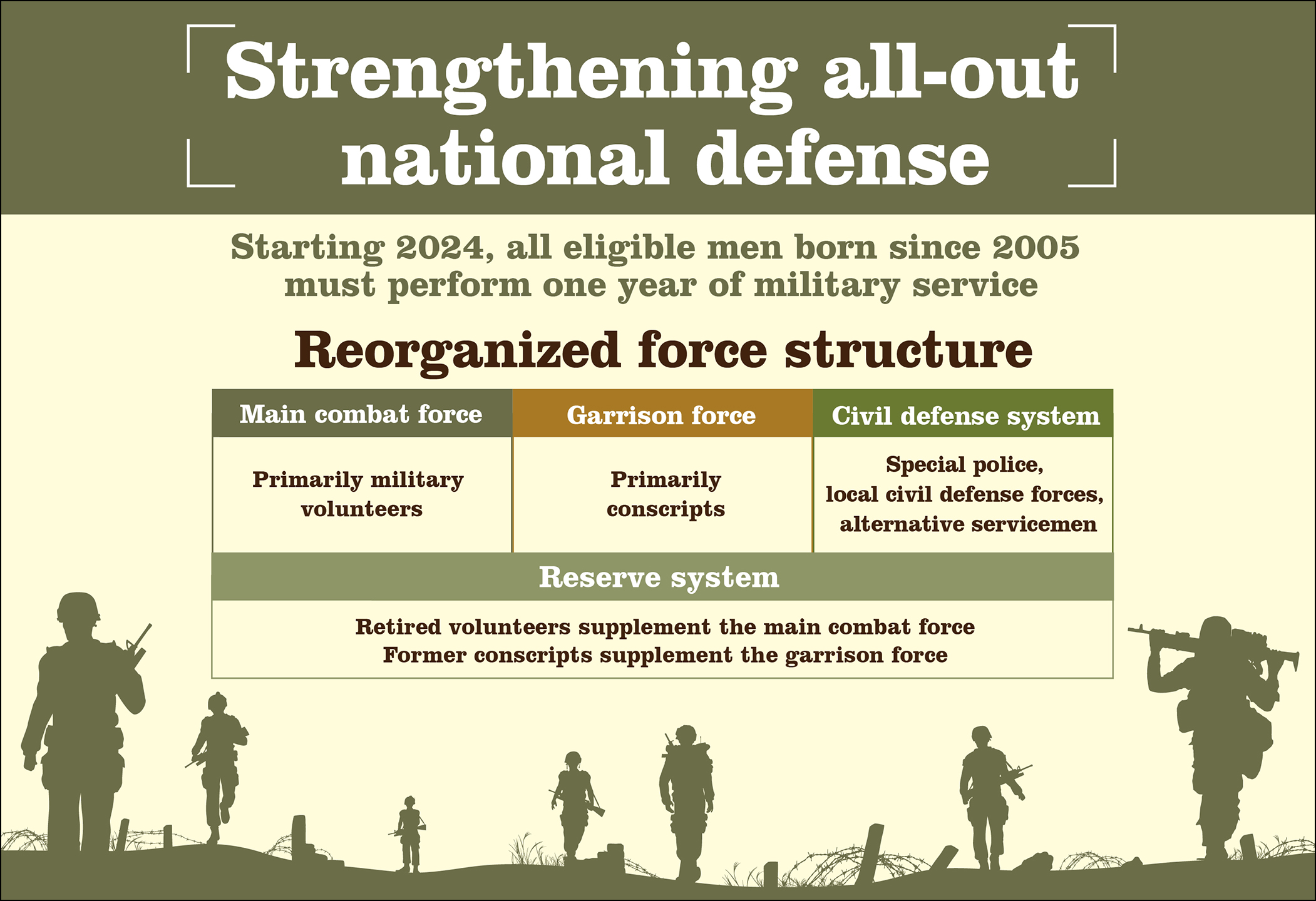 (4) The reserve system, composed of retired military volunteers to supplement the main combat force, and former conscripts to supplement the garrison force, which can be mobilized in the event of war to support combat operations and defend urban and rural areas.