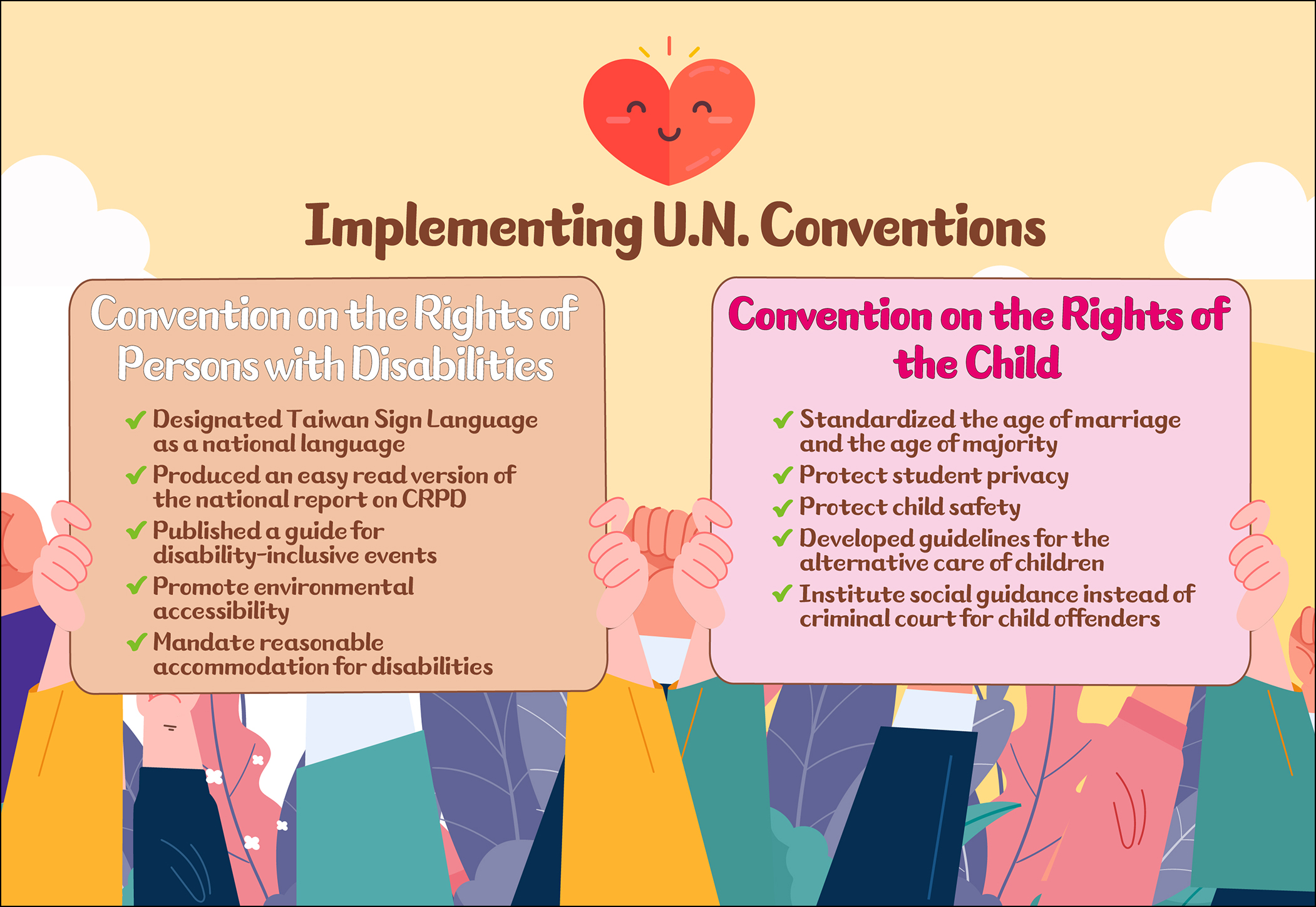 Human rights are universal values—a common language that crosses national borders. The United Nations passed the Convention on the Rights of the Child (CRC) in 1989 and the Convention on the Rights of Persons with Disabilities (CRPD) in 2006 to safeguard the rights of children and disabled people, respectively. While not a U.N. member state, Taiwan nevertheless passed both the Act to Implement the Convention on the Rights of Persons with Disabilities and the Implementation Act of the Convention on the Rights of the Child in 2014, based on its commitment to and respect for human rights and to bring domestic laws in line with international norms. Taiwan has pledged to take concrete action to protect and enshrine the rights of these two groups.
