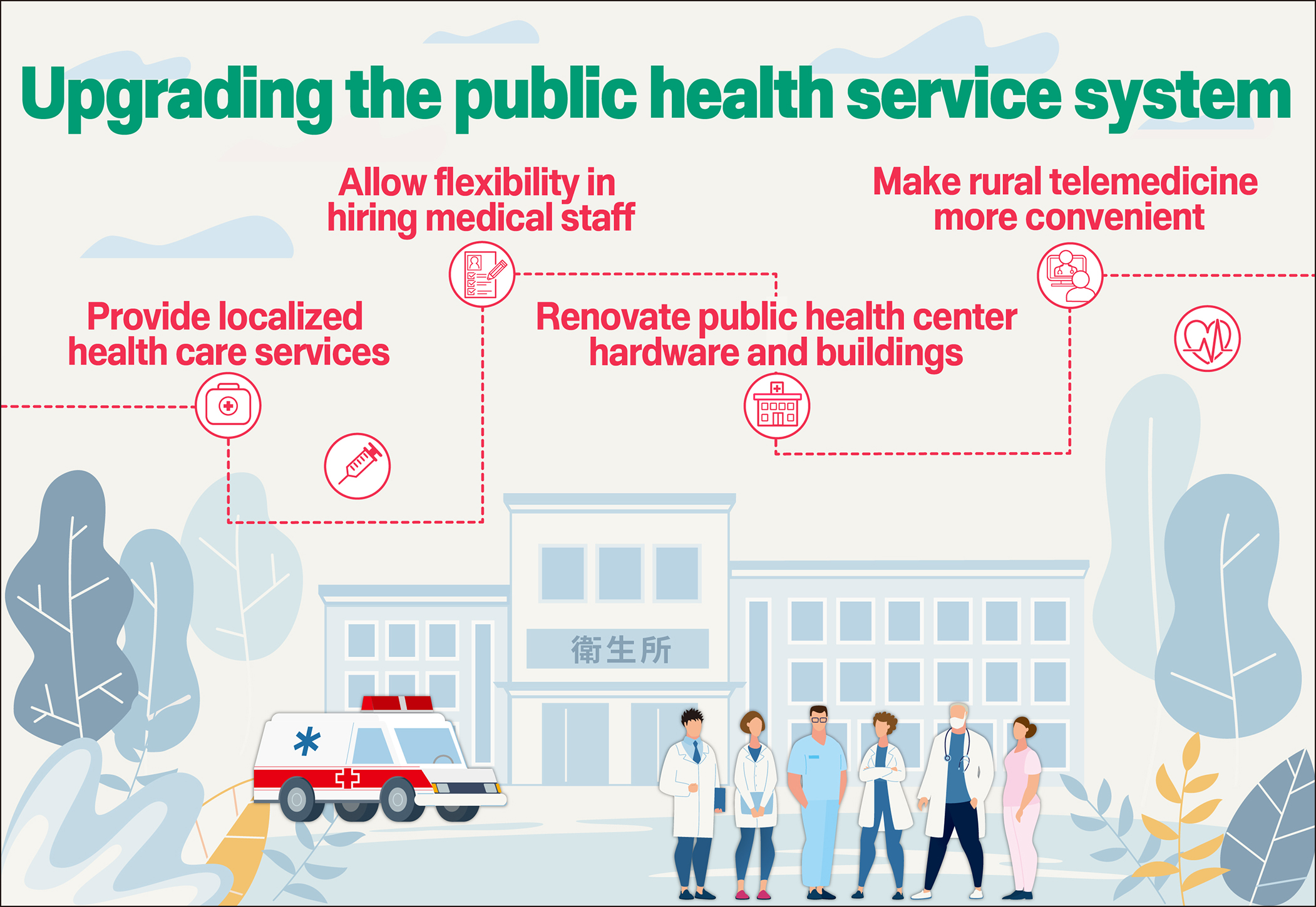 To enhance the service capabilities of public health centers, and address issues of aging buildings and rural health care needs, the government has introduced four major strategies for upgrading the public health service system. These strategies aim to allow for more reasonable and efficient use of basic health care resources, gradually transforming public health centers into "community health care management centers" that can ultimately provide "localized care."