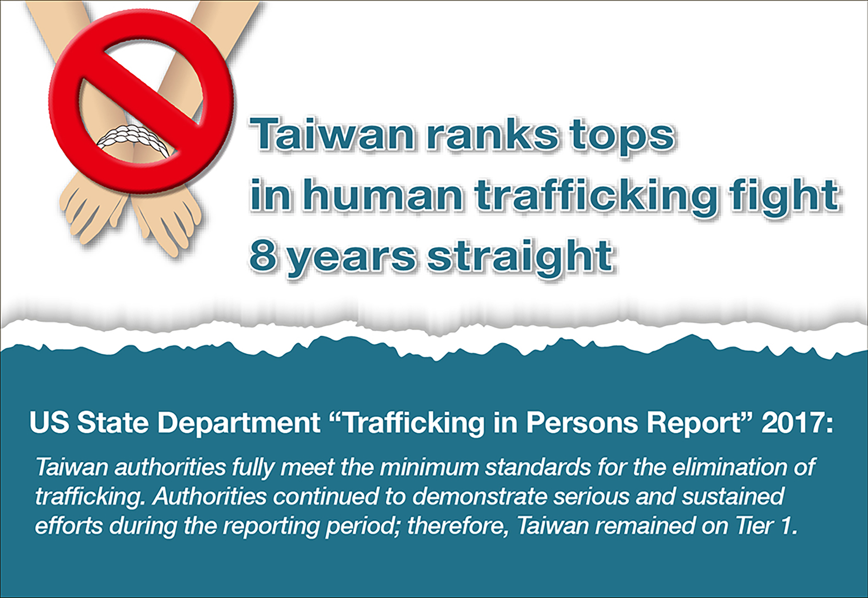 Recognizing these and other longstanding public-private collaborations to fight trafficking and protect human rights, the U.S. placed Taiwan in Tier 1 in the 2017 TIP Report, the eighth consecutive year that Taiwan has earned the top-tier status. This year's report cites Taiwan's sustained efforts to investigate trafficking cases, access to shelters and other victim services, new regulations requiring standard contracts and benefits for foreign fishermen hired overseas, training programs for law enforcement officials, and campaigns to increase public awareness of trafficking crimes.
