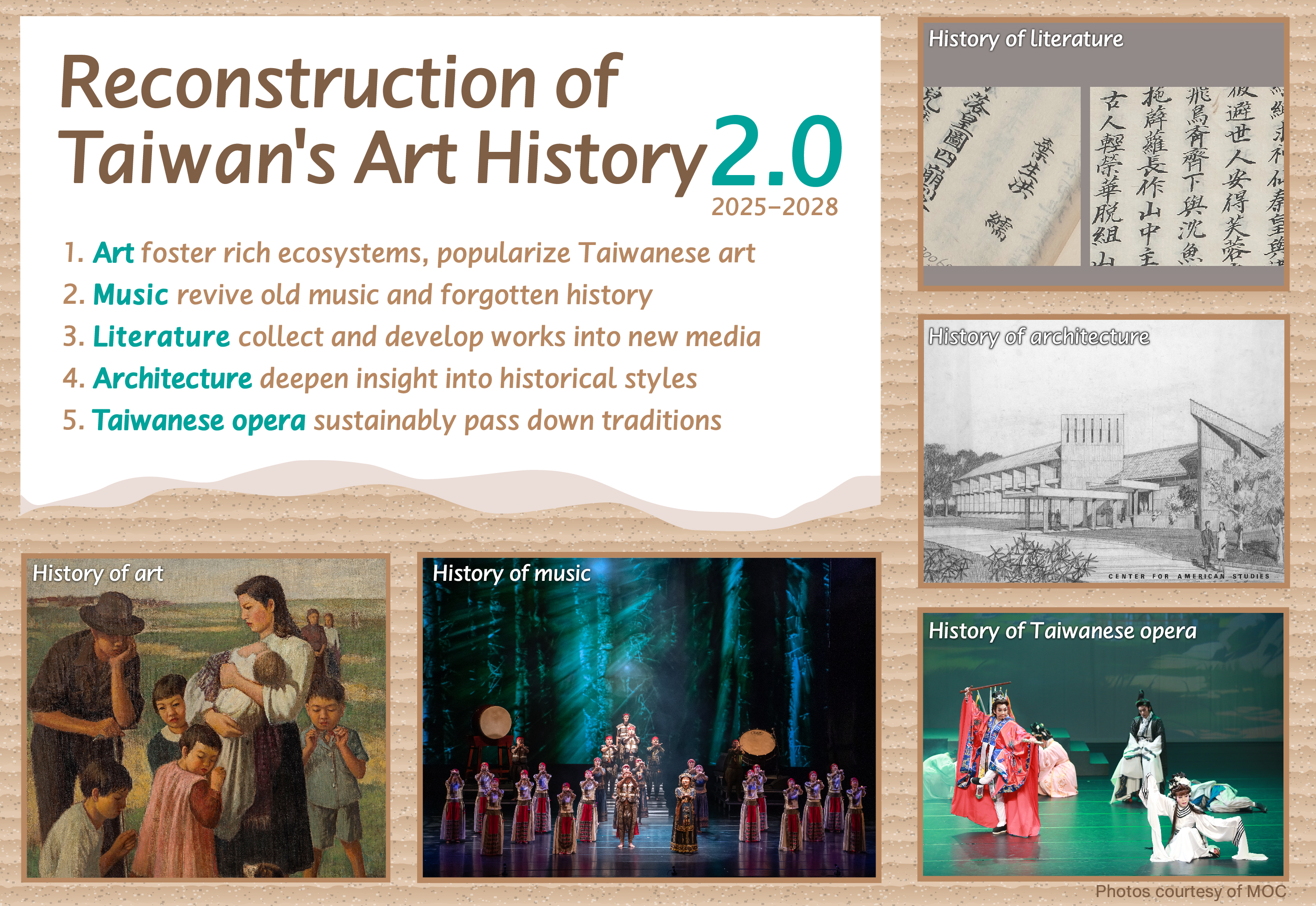 Now, the Executive Yuan has approved version 2.0 of the Reconstruction of Taiwan's Art History project (2025-2028) to continue enriching the country's culture and building upon Taiwan's cultural DNA and cultural memory, as well as to realize President Lai Ching-te's vision of revitalizing the nation through art. The updated project will support the collection, research and promotion of the history of Taiwan's art, music, literature, architecture and traditional opera, thereby inspiring dialogue about the interplay between land, culture and different generations, as well as sparking rediscovery of Taiwan's art history and cultural identity.