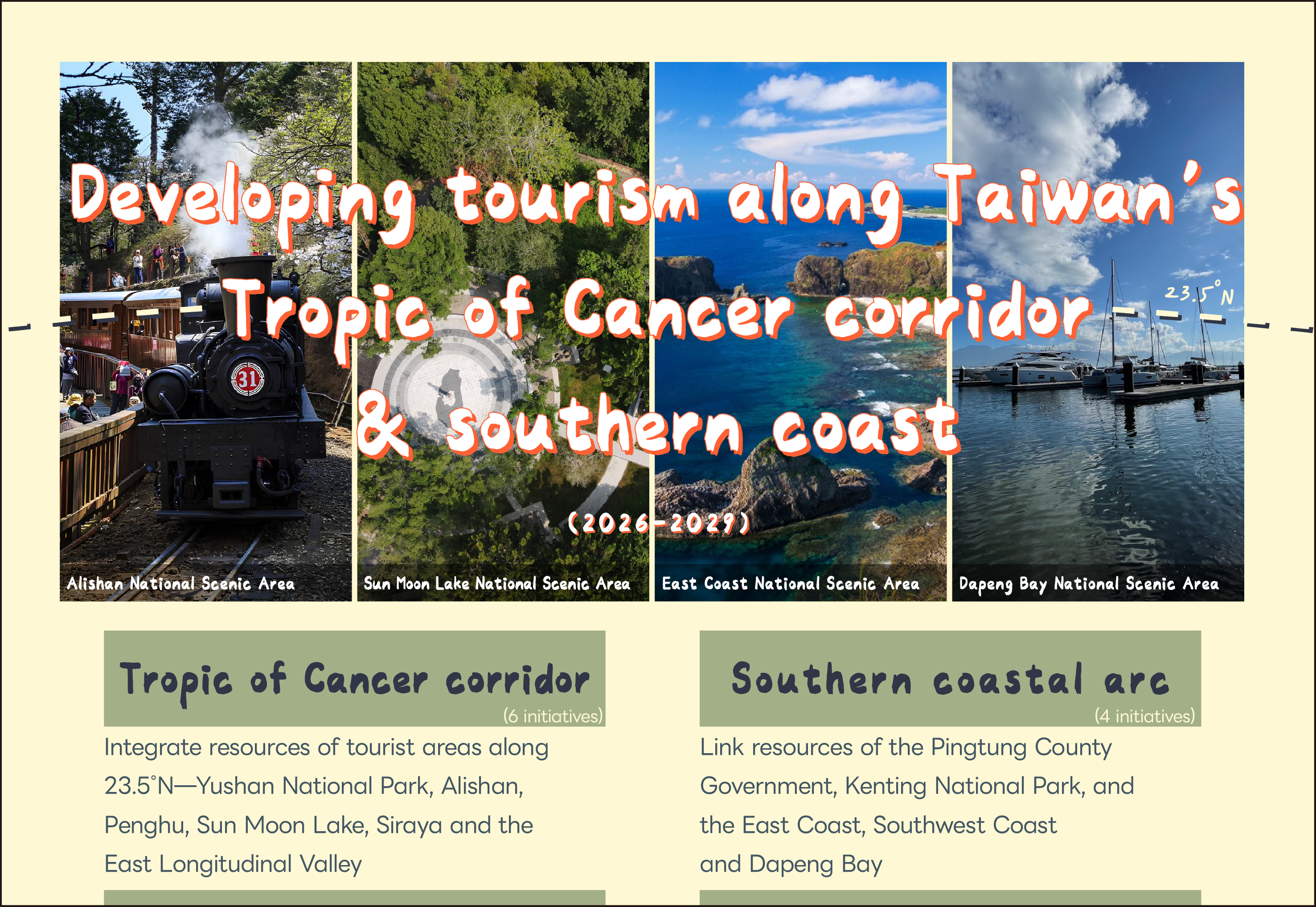 ■ Tropic of Cancer corridor: Launch six initiatives to integrate the resources of major tourism areas along latitude 23.5°N—Yushan National Park and the Alishan, Penghu, Sun Moon Lake, Siraya, and East Longitudinal Valley National Scenic Areas—connecting the diverse attractions of central and southern Taiwan and forming a world-class tourism corridor and oasis.