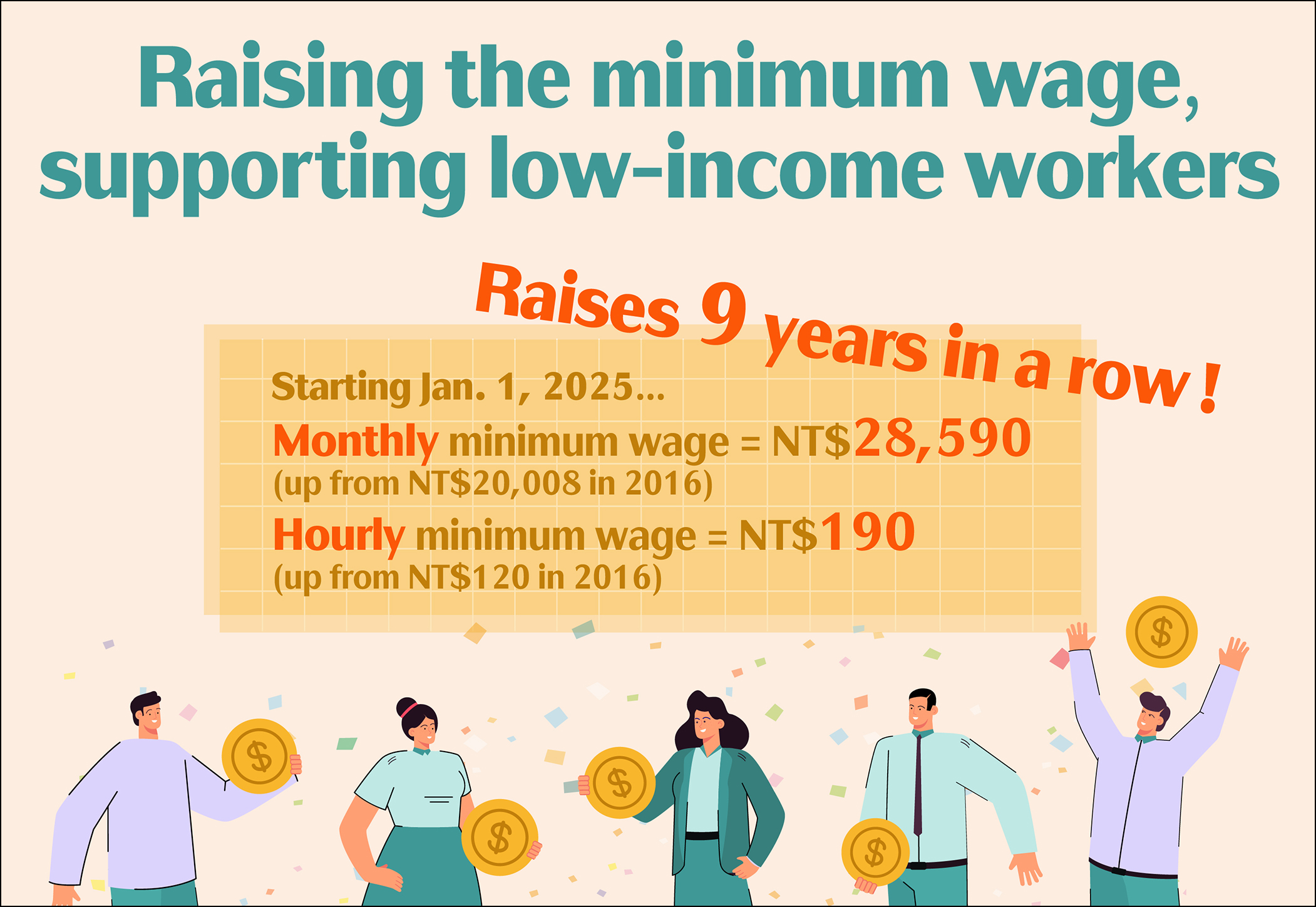 On January 1, 2024, the Minimum Wage Act came into effect, ensuring that the government continues to support the living standards of low-income workers. In January 2025, the minimum wage was increased again, with the monthly minimum wage rising by 42.9% from NT$20,008 (US$609) in 2016 to NT$28,590 (US$870) in 2025, and the hourly minimum wage by 58.3% from NT$120 (US$3.65) in 2016 to NT$190 (US$5.78) in 2025, fulfilling the government's promise to safeguard the basic livelihoods of workers and their families.