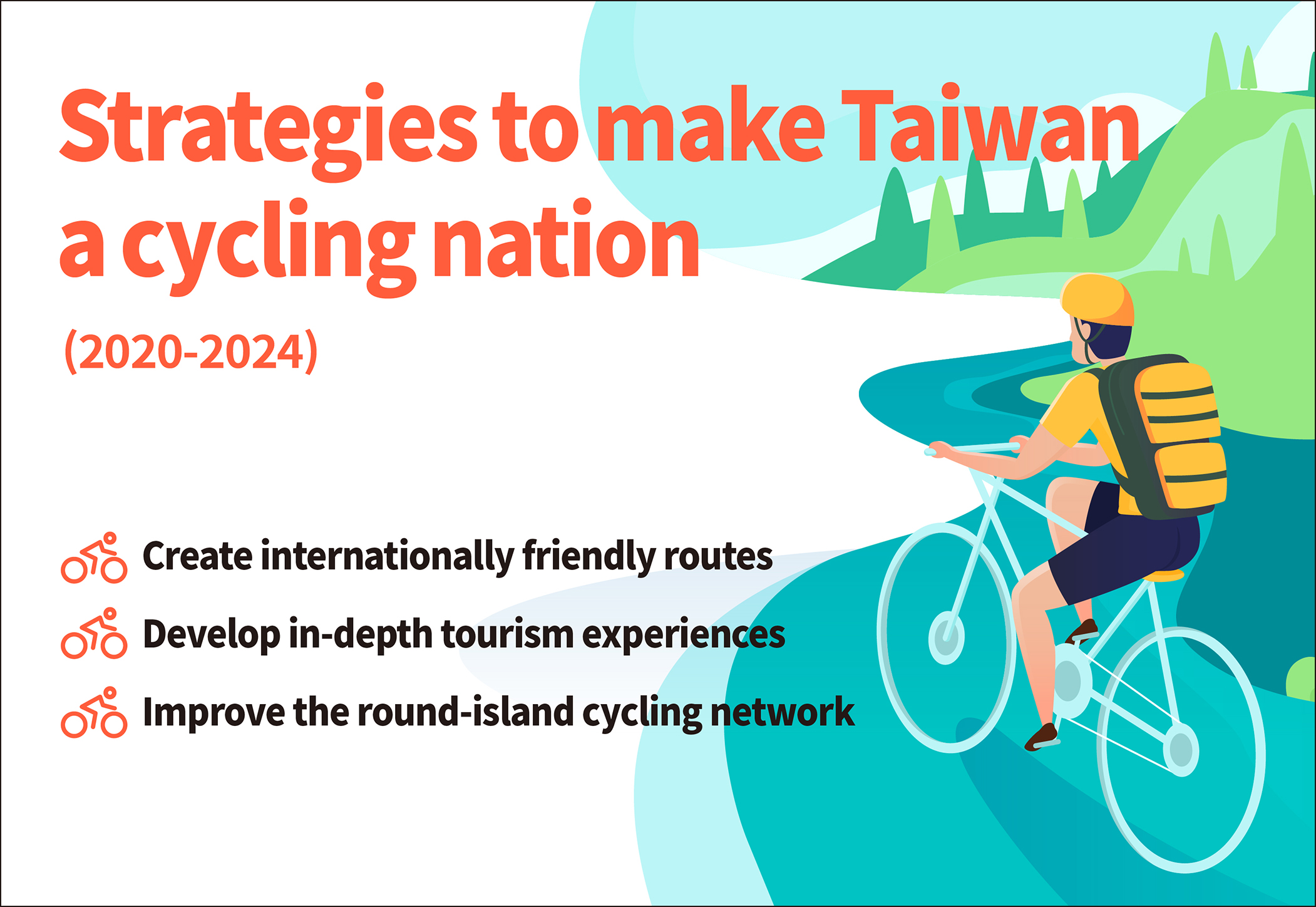 ■ Create internationally oriented cycling routes and unique travel experiences: Create a series of cycling events combining Taiwan's unique landscapes and features, and provide certification for completing challenges. Expand bicycling tourism information services while connecting bike paths to railway and bus transport options.