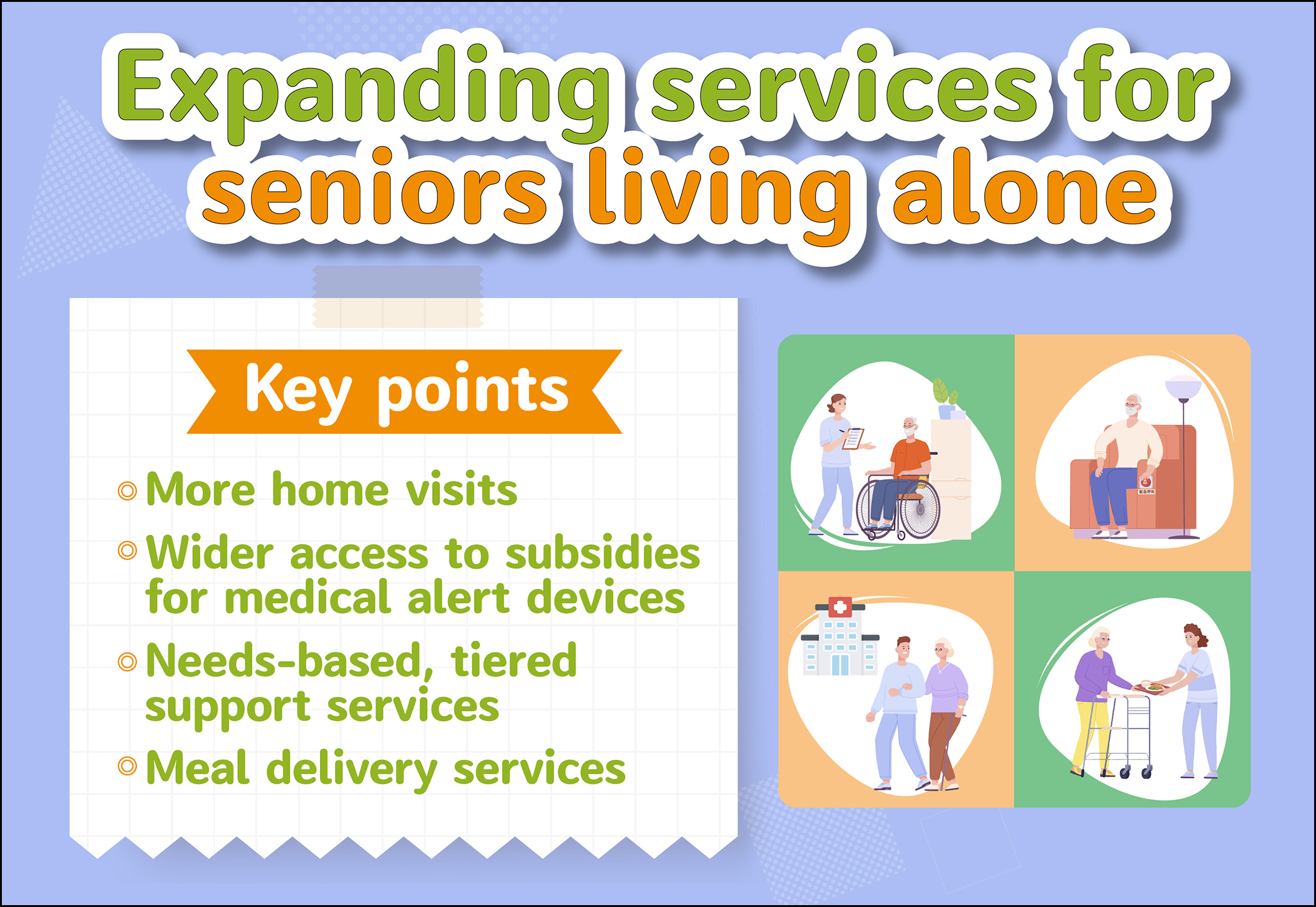 ■ Expand access to subsidies for medical alert devices: Continue providing subsidies for seniors living alone—regardless of financial status—to install fixed or wearable emergency assistance devices with features such as GPS tracking, emergency call buttons, and fall or inactivity detection.