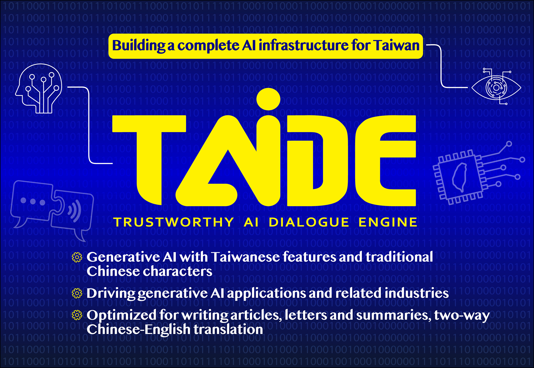 In April 2023, the government initiated the Trustworthy AI Dialogue Engine (TAIDE) project to produce a generative AI chatbot with Taiwanese features and traditional Chinese character support. TAIDE is optimized for writing articles, letters and summaries, as well as two-way Chinese-English translation. TAIDE will also help to popularize generative AI applications and drive forward development in related industries.