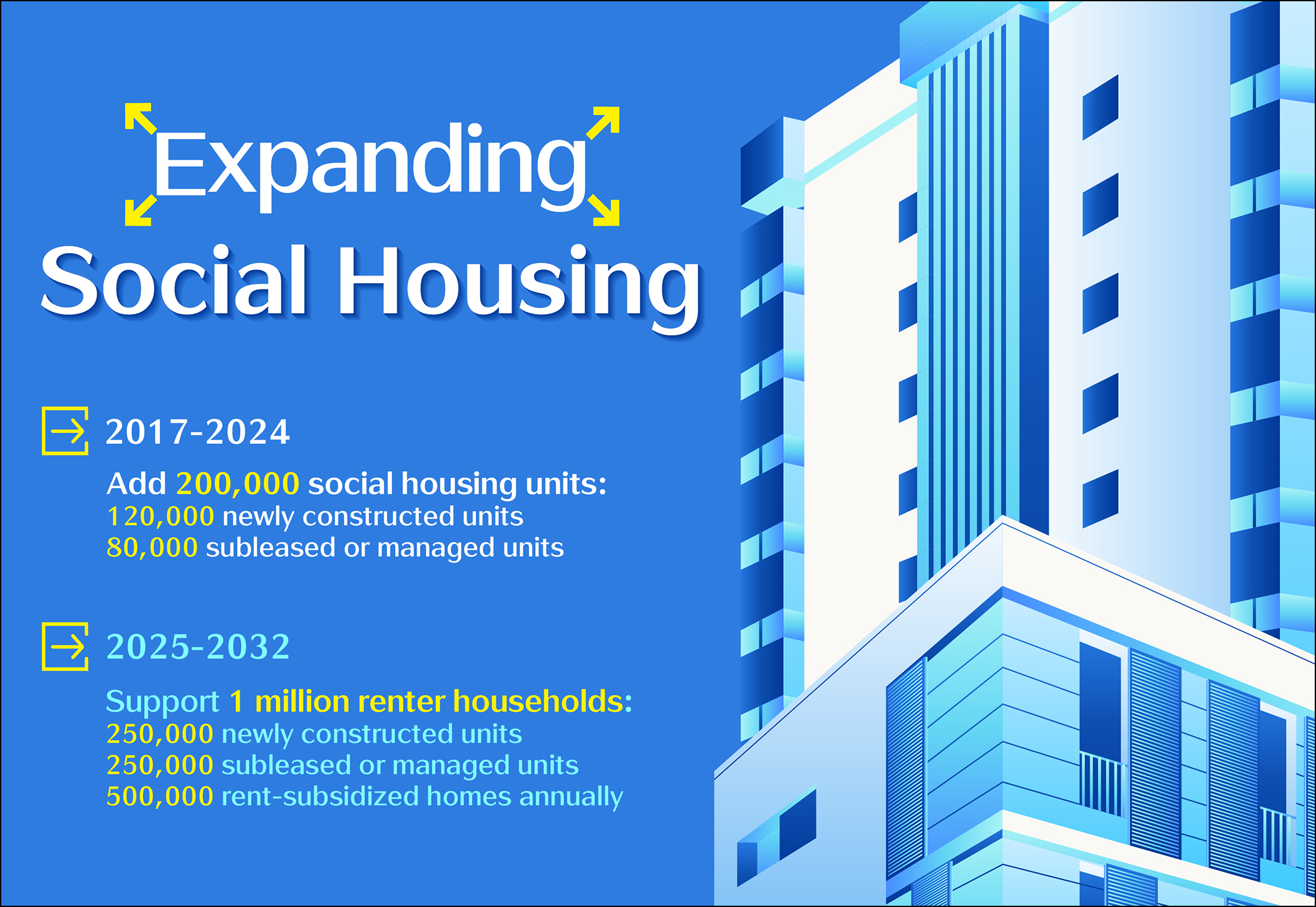 Moving forward, the government will implement a 2025-2032 program to support 1 million renter households (including 250,000 newly constructed social housing units and 250,000 subleased or managed units over the eight-year period, as well as rent subsidies provided annually for 500,000 homes), which will more swiftly fulfill the housing needs of renters and young people, and substantially ease the burden of housing costs.