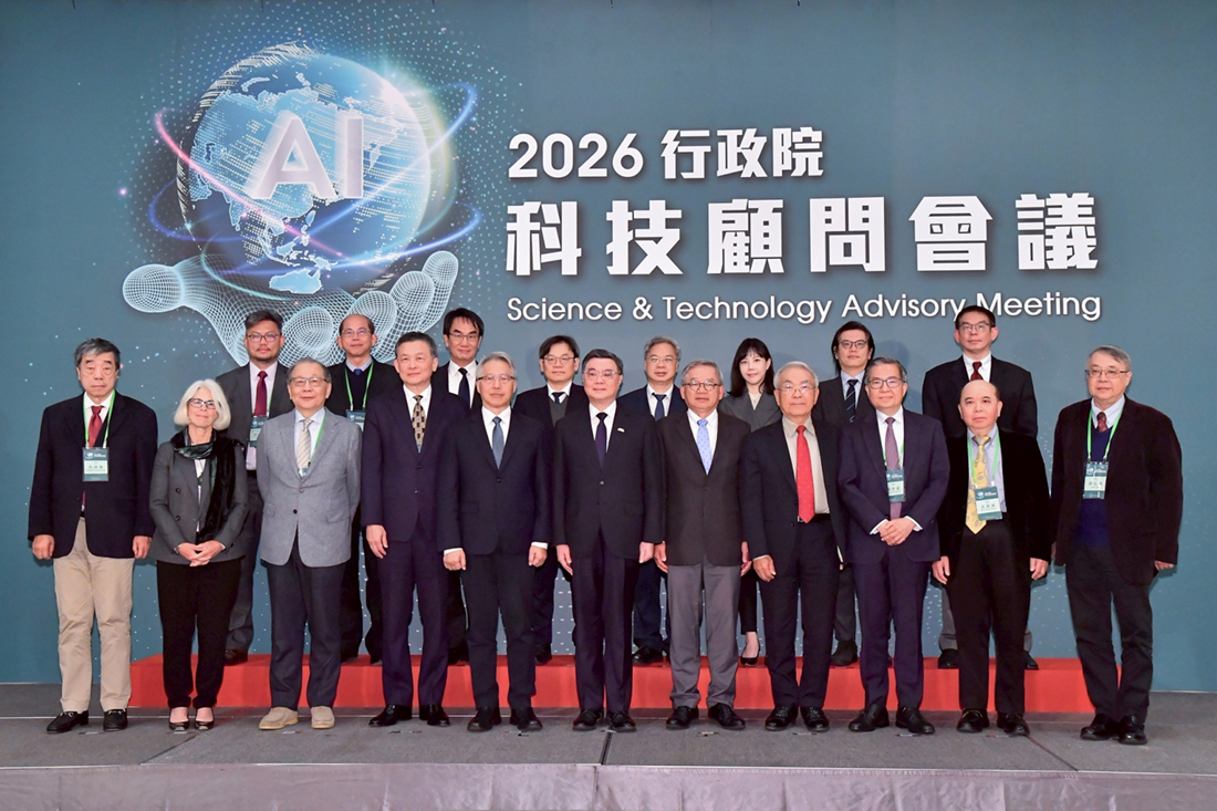 Premier Cho Jung-tai (front row, center) attends the closing ceremony of the Executive Yuan's 2026 Science & Technology Advisory Meeting, calling for stronger public-private cooperation to advance cutting-edge technologies and their applications.