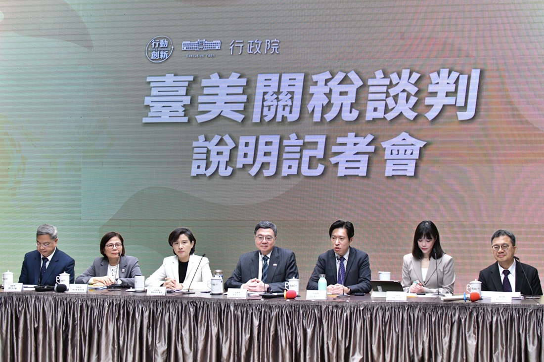 Premier Cho Jung-tai (center) leads a press conference explaining the outcomes of the latest stage of Taiwan-U.S. tariff negotiations, emphasizing their positive impact on Taiwan's strategic position.